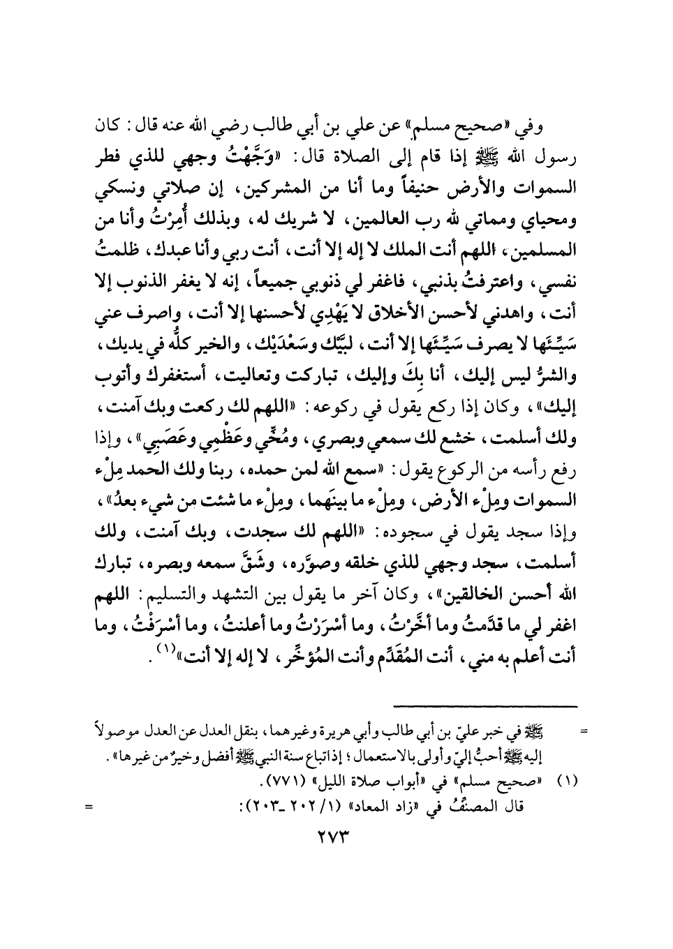 وفي "صحيح مسلم" عن علي بن أبي طالب رضي الله عنه قال: كان رسول الله -صَلَّى اللهُ عَلَيْهِ وَسَلَّمَ- إذا قام إلى الصلاة قال: "وَجَّهْتُ وجهي للذي فطر السموات والأرض حنيفًا وما أنا من المشركين، إن صلاتي ونسكي ومحياي ومماتي لله رب العالمين، لا شريك له، وبذلك أُمِرْتُ وأنا من المسلمين، اللَّهُمَّ أنت الملك لا إله إلا أنت، أنت ربي وأنا عبدك، ظلمتُ نفسي، واعترفتُ بذنبي، فاغفر لي ذنوبي جميعًا، إنه لا يغفر الذنوب إلا أنت، واهدني لأحسن الأخلاق لا يَهْدِي لأحسنها إلا أنت، واصرف عني سَيِّئَها لا يصرف سَيِّئَها إلا أنت، لبَّيْك وسَعْدَيْك، والخير كلُّه في يديك، والشرُّ ليس إليك، أنا بِكَ وإليك، تباركت وتعاليت، أستغفرك وأتوب إليك"، وكان إذا ركع يقول في ركوعه: "اللَّهُمَّ لك ركعت وبك آمنت، ولك أسلمت، خشع لك سمعي وبصرى، ومُخّي وعَظْمِي وعَصَبِي"، وإذا رفع رأسه من الركوع يقول: "سمع الله لمن حمده، ربنا ولك الحمد مِلْء السموات وملْء الأرض، وملْء ما بينَهما، وملْء ما شئت من شيء بعدُ"، وإذا سجد يقول في سجوده: "اللَّهُمَّ لك سجدت، وبك آمنت، ولك أسلمت، سجد وجهي للذي خلقه وصوَّره، وشَقَّ سمعه وبصره، تبارك الله أحسن الخالقين"، وكان آخر ما يقول بين التشهد والتسليم: اللَّهُمَّ اغفر لي ما قدَّمتُ وما أخَّرْتُ، وما أسْرَرْتُ وما أعلنتُ، وما أسْرَفْتُ، وما أنت أعلم به مني، أنت المُقَدِّم وأنت المُؤخِّر، لا إله إلا أنت" (¬١) .