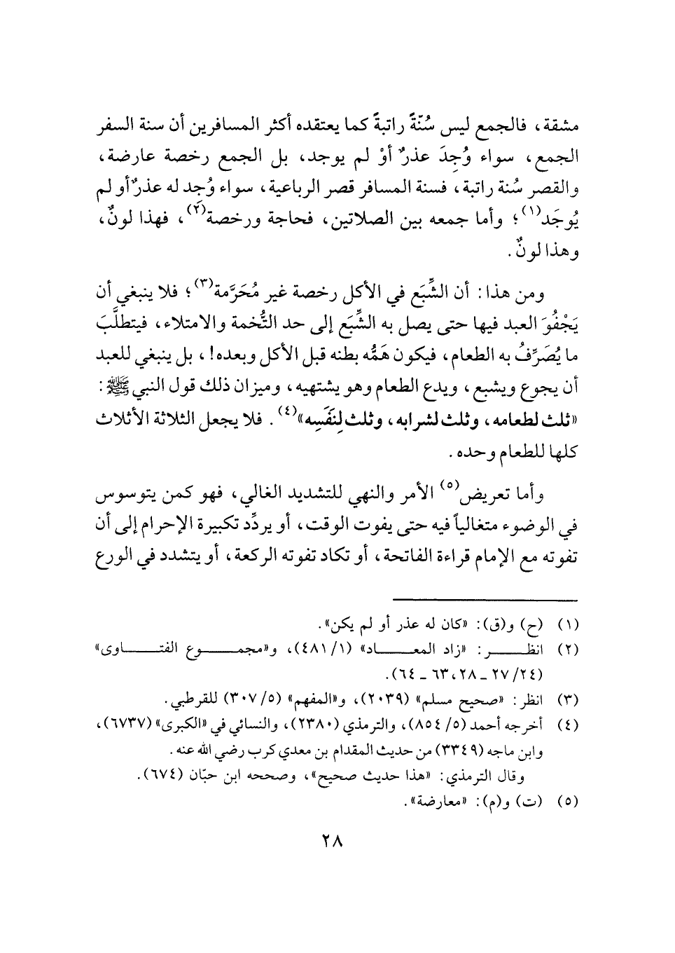 مشقة، فالجمع ليس سُنّةً راتبةً كما يعتقده أكثر المسافرين أن سنة السفر الجمع، سواء وُجِدَ عذرٌ أوْ لم يوجد، بل الجمع رخصة عارضة، والقصر سُنة راتبة، فسنة المسافر قصر الرباعية، سواء وُجد له عذرٌ أو لم يُوجَد (¬١)؛ وأما جمعه بين الصلاتين، فحاجة ورخصة (¬٢)، فهذا لونٌ، وهذا لونٌ.