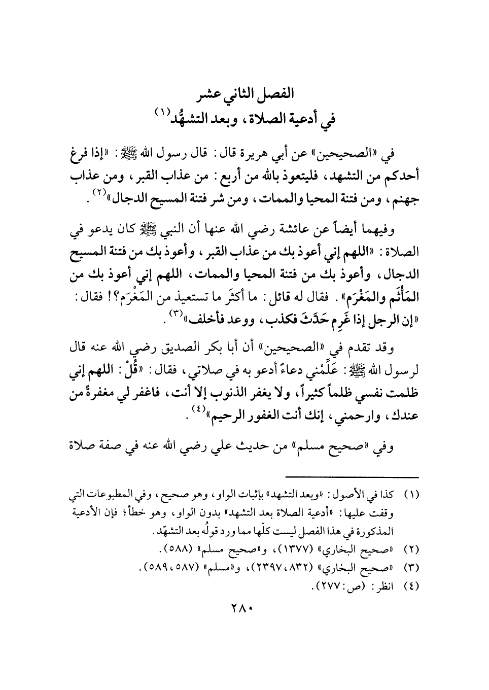 (¬١) كذا في الأصول: "وبعد التشهد" بإثبات الواو، وهو صحيح، وفي المطبوعات التي وقفت عليها: "أدعية الصلاة بعد التشهد" بدون الواو، وهو خطأ؛ فإن الأدعية المذكورة في هذا الفصل ليست كلّها مما ورد قولُه بعد التشهّد.