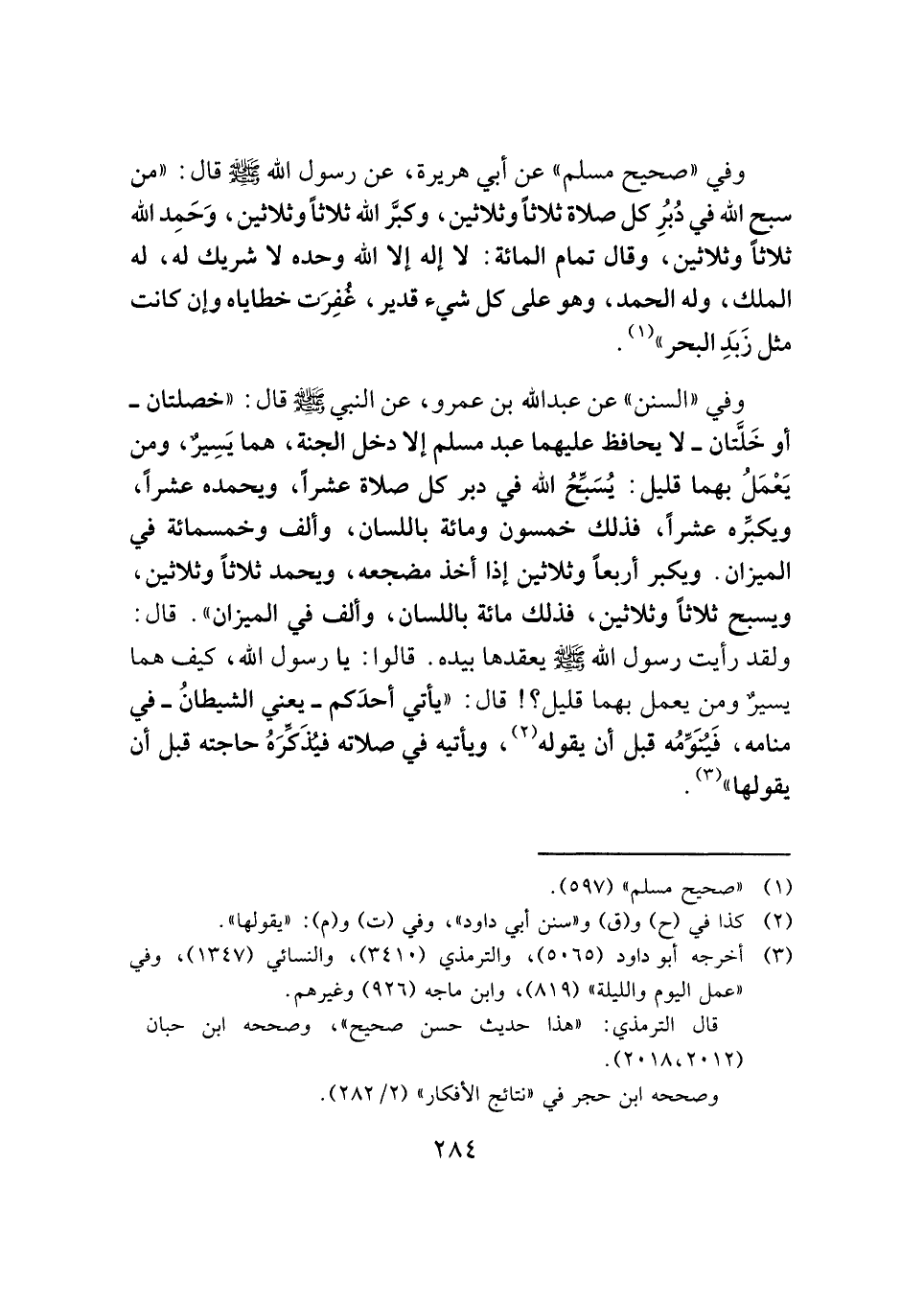 وفي "السنن" عن عبد الله بن عمرو، عن النبي -صَلَّى اللهُ عَلَيْهِ وَسَلَّمَ- قال: "خصلتان -أو خَلَّتان- لا يحافظ عليهما عبد مسلم إلا دخل الجنة، هما يَسِيرٌ، ومن يَعْمَلُ بهما قليل: يُسَبِّحُّ الله في دبر كل صلاة عشرًا، ويحمده عشرًا، ويكبِّره عشرًا، فذلك خمسون ومائة باللسان، وألف وخمسمائة في الميزان. ويكبر أربعًا وثلاثين إذا أخذ مضجعه، ويحمد ثلاثًا وثلاثين، ويسبح ثلاثًا وثلاثين، فذلك مائة باللسان، وألف في الميزان". قال: ولقد رأيت رسول الله -صَلَّى اللهُ عَلَيْهِ وَسَلَّمَ- يعقدها بيده. قالوا: يا رسول الله، كيف هما يسيرٌ ومن يعمل بهما قليل؟! قال: "يأتي أحدَكم -يعني الشيطانُ- في منامه، فَيُنَوِّمُه قبل أن يقوله (¬٢) ، ويأتيه في صلاته فيُذَكِّرَهُ حاجته قبل أن يقولها" (¬٣) .