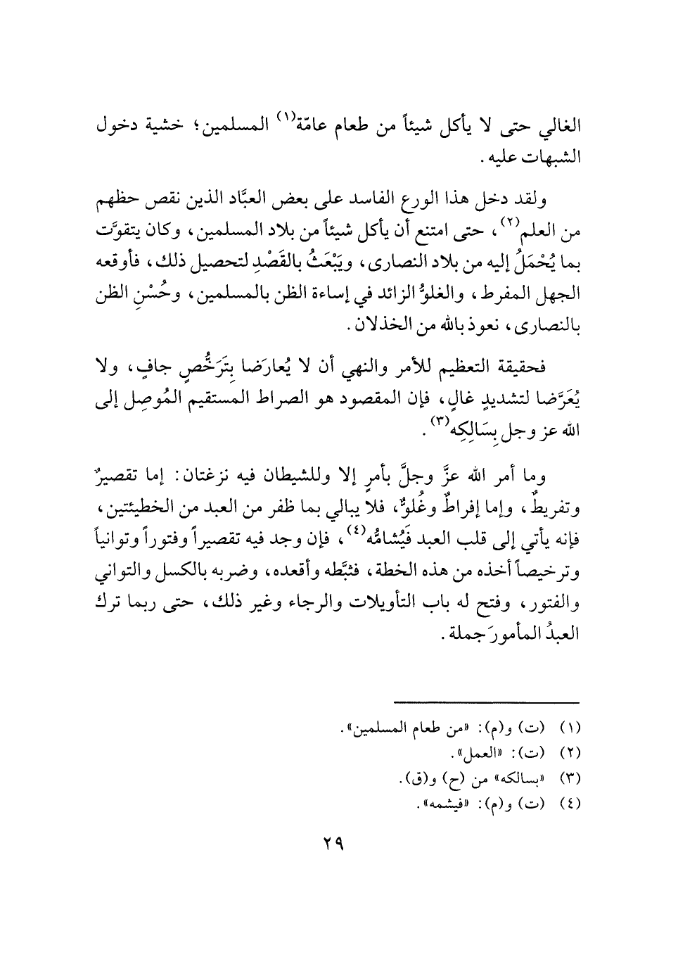 ولقد دخل هذا الورع الفاسد على بعض العبَّاد الذين نقص حظهم من العلم (¬٢) ، حتى امتنع أن يأكل شيئًا من بلاد المسلمين، وكان يتقوَّت بما يُحْمَلُ إليه من بلاد النصارى، ويَبْعَثُ بالقَصْدِ لتحصيل ذلك، فأوقعه الجهل المفرط، والغلوُّ الزائد في إساءة الظن بالمسلمين، وحُسْنِ الظن بالنصارى، نعوذ بالله من الخذلان.