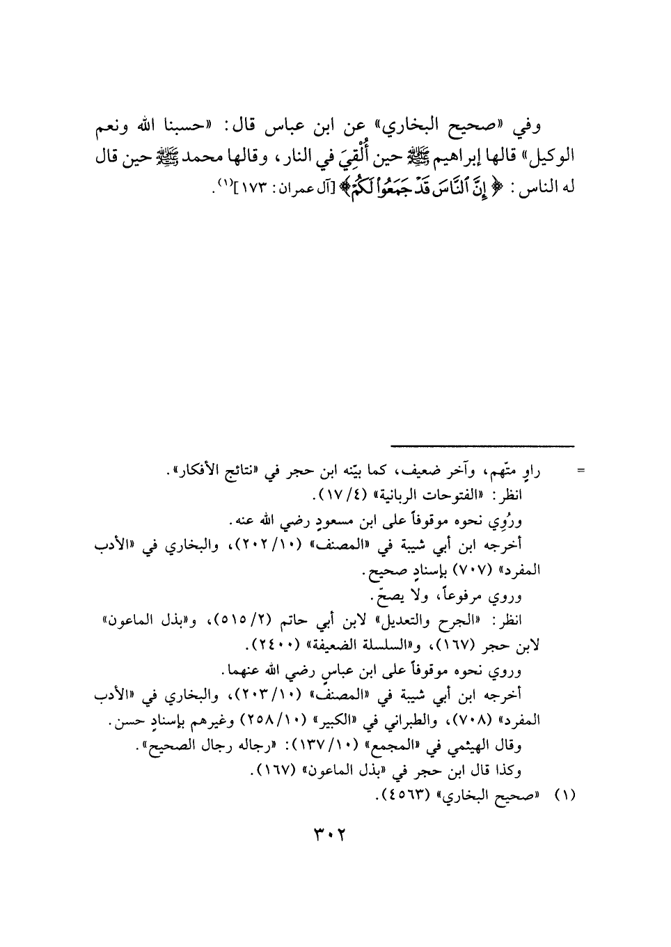 وفي "صحيح البخاري" عن ابن عباس قال: "حسبنا الله ونعم الوكيل" قالها إبراهيم -صَلَّى اللهُ عَلَيْهِ وَسَلَّمَ- حين أُلْقِيَ في النار، وقالها محمد -صَلَّى اللهُ عَلَيْهِ وَسَلَّمَ- حين قال له الناس: {إِنَّ النَّاسَ قَدْ جَمَعُوا لَكُمْ} [آل عمران: ١٧٣] (¬١) .
