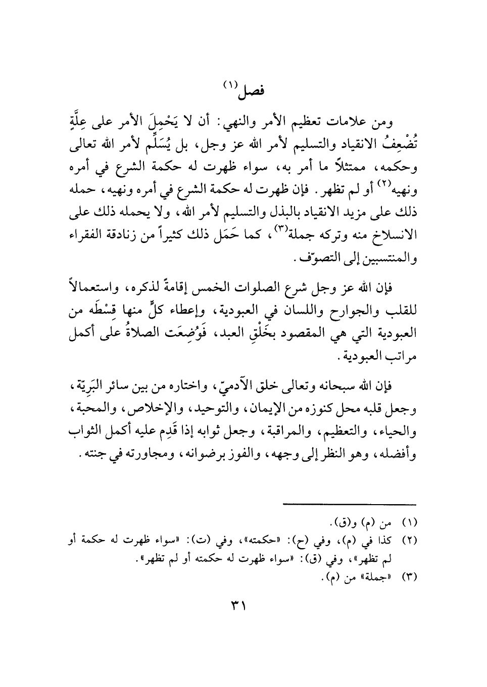 ومن علامات تعظيم الأمر والنهي: أن لا يَحْمِلَ الأمر على عِلَّةٍ تُضْعِفُ الانقياد والتسليم لأمر الله عز وجل، بل يُسَلِّم لأمر الله تعالى وحكمه، ممتثلًا ما أمر به، سواء ظهرت له حكمة الشرع في أمره ونهيه (¬٢) أو لم تظهر. فإن ظهرت له حكمة الشرع في أمره ونهيه، حمله ذلك على مزيد الانقياد بالبذل والتسليم لأمر الله، ولا يحمله ذلك على الانسلاخ منه وتركه جملة (¬٣)، كما حَمَل ذلك كثيرًا من زنادقة الفقراء والمنتسبين إلى التصوّف.