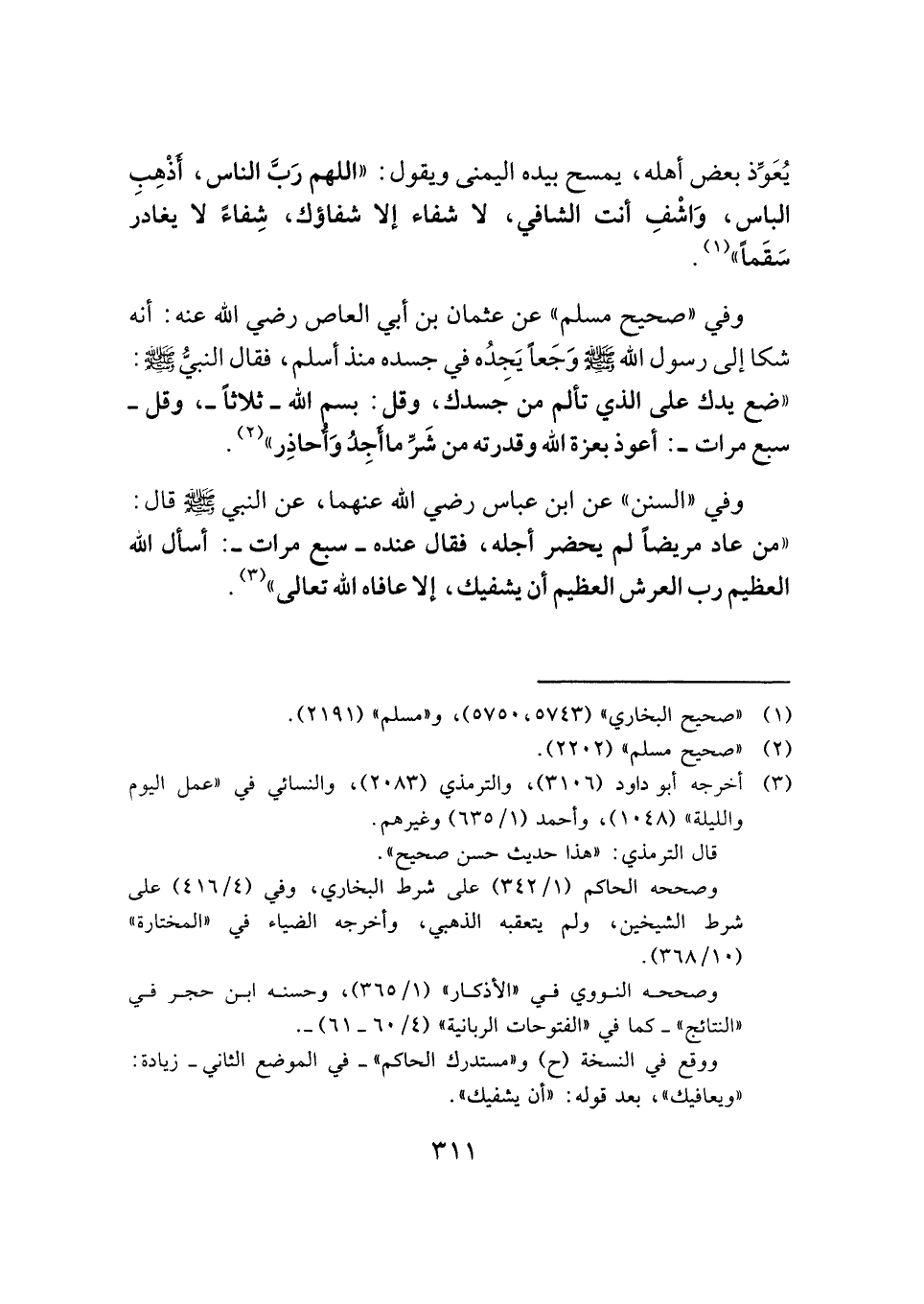 وفي "صحيح مسلم" عن عثمان بن أبي العاص -رضي الله عنه-: أنه شكا إلى رسول الله -صَلَّى اللهُ عَلَيْهِ وَسَلَّمَ- وَجَعًا يَجِدُه في جسده منذ أسلم، فقال النبيُّ -صَلَّى اللهُ عَلَيْهِ وَسَلَّمَ-: "ضع يدك على الذي تألم من جسدك، وقل: بسم الله -ثلاثًا-، وقل -سبع مرات-: أعوذ بعزة الله وقدرته من شَرِّ ما أَجِدُ وَأُحاذِر" (¬٢) .