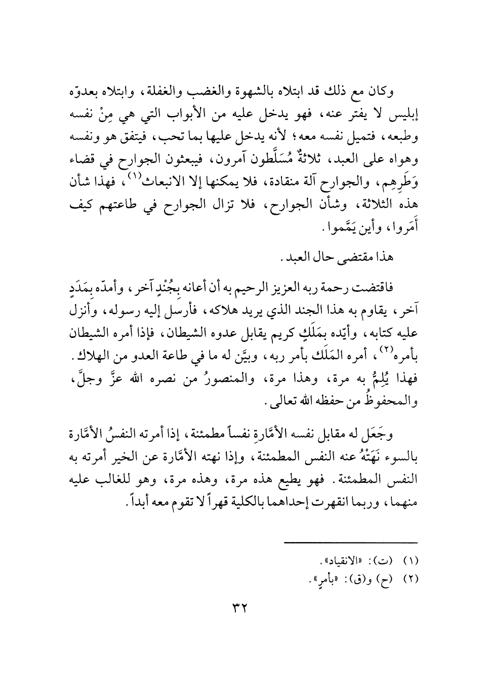 وجَعَل له مقابل نفسه الأمَّارةِ نفسًا مطمئنة، إذا أمرته النفسُ الأمَّارة بالسوء نَهَتْهُ عنه النفس المطمئنة، وإذا نهته الأمَّارة عن الخير أمرته به النفس المطمئنة. فهو يطيع هذه مرة، وهذه مرة، وهو للغالب عليه منهما، وربما انقهرت إحداهما بالكلية قهرًا لا تقوم معه أبدًا.