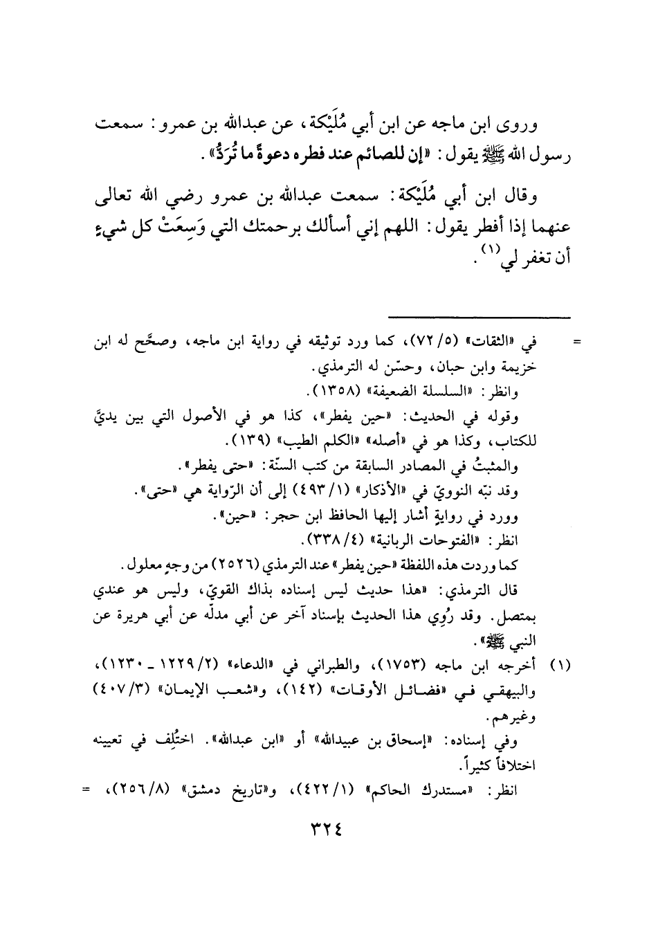 وروى ابن ماجه عن ابن أبي مُلَيْكة، عن عبد الله بن عمرو: سمعت رسول الله -صَلَّى اللهُ عَلَيْهِ وَسَلَّمَ- يقول: "إن للصائم عند فطره دعوةً ما تُرَدُّ".