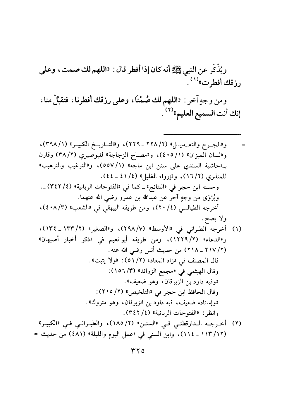 ومن وجهٍ آخر: "اللَّهُمَّ لك صُمْنَا، وعلى رزقك أفطرنا، فتقبَّلْ منا، إنك أنت السميع العليم" (¬٢) .