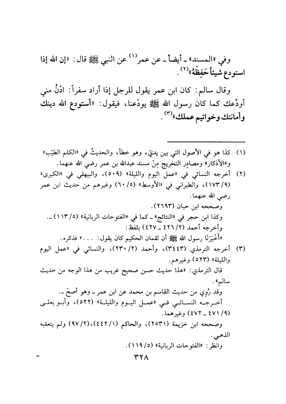 وقال سالم: كان ابن عمر يقول للرجل إذا أراد سفرًا: ادْنُ مني أودِّعك كما كان رسول الله -صَلَّى اللهُ عَلَيْهِ وَسَلَّمَ- يودّعنا، فيقول: "أستودع الله دينك وأمانتك وخواتيم عملك" (¬٣) .