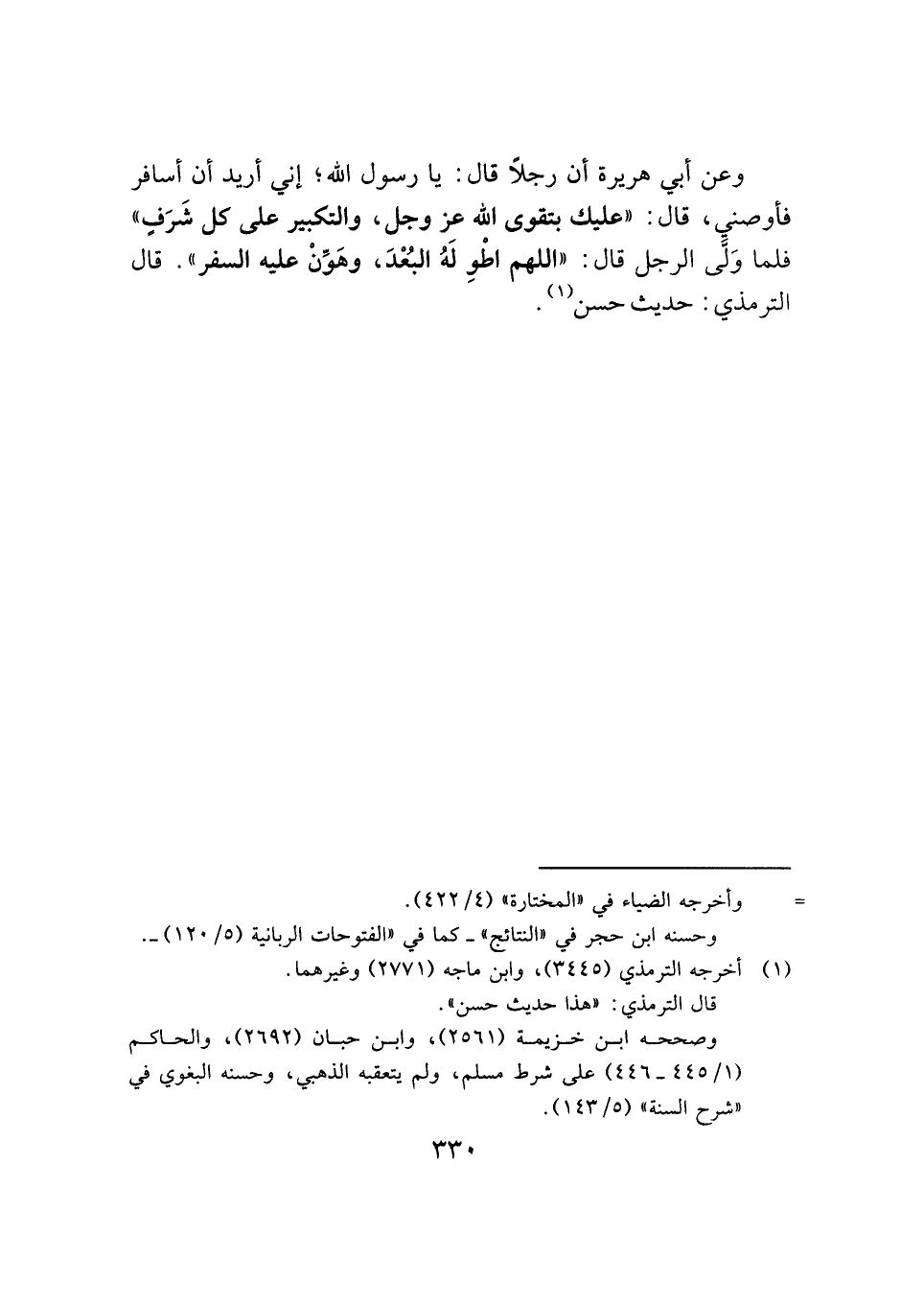وعن أبي هريرة أن رجلًا قال: يا رسول الله؛ إني أريد أن أسافر فأوصني، قال: "عليك بتقوى الله عز وجل، والتكبير على كل شَرَفٍ" فلما وَلَّى الرجل قال: "اللَّهُمَّ اطْوِ لَهُ البُعْدَ، وهَوِّنْ عليه السفر". قال الترمذي: حديث حسن (¬١) .