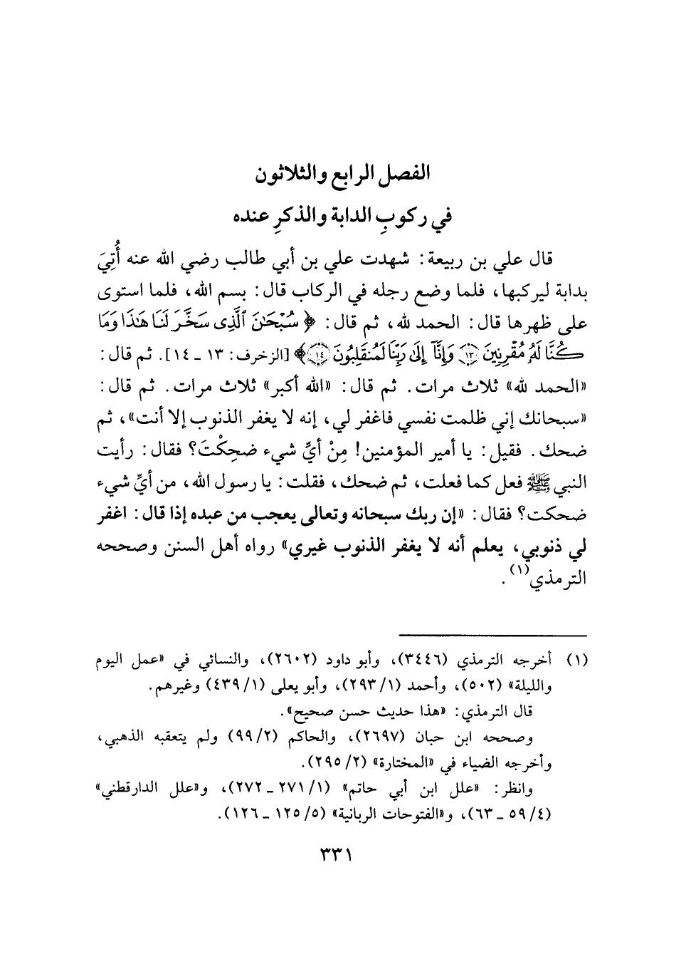 قال علي بن ربيعة: شهدت علي بن أبي طالب -رضي الله عنه- أُتِيَ بدابة ليركبها، فلما وضع رجله في الركاب قال: بسم الله، فلما استوى على ظهرها قال: الحمد لله، ثم قال: {سُبْحَانَ الَّذِي سَخَّرَ لَنَا هَذَا وَمَا كُنَّا لَهُ مُقْرِنِينَ (١٣) وَإِنَّا إِلَى رَبِّنَا لَمُنْقَلِبُونَ (١٤)} [الزخرف: ١٣ - ١٤]. ثم قال: "الحمد لله" ثلاث مرات. ثم قال: "الله أكبر" ثلاث مرات. ثم قال: "سبحانك إني ظلمت نفسي فاغفر لي، إنه لا يغفر الذنوب إلا أنت"، ثم ضحك. فقيل: يا أمير المؤمنين! مِنْ أيِّ شيء ضحِكْتَ؟ فقال: رأيت النبي -صَلَّى اللهُ عَلَيْهِ وَسَلَّمَ- فعل كما فعلت، ثم ضحك، فقلت: يا رسول الله، من أيِّ شيء ضحكت؟ فقال: "إن ربك سبحانه وتعالى يعجب من عبده إذا قال: اغفر لي ذنوبي، يعلم أنه لا يغفر الذنوب غيري" رواه أهل السنن وصححه الترمذي (¬١).