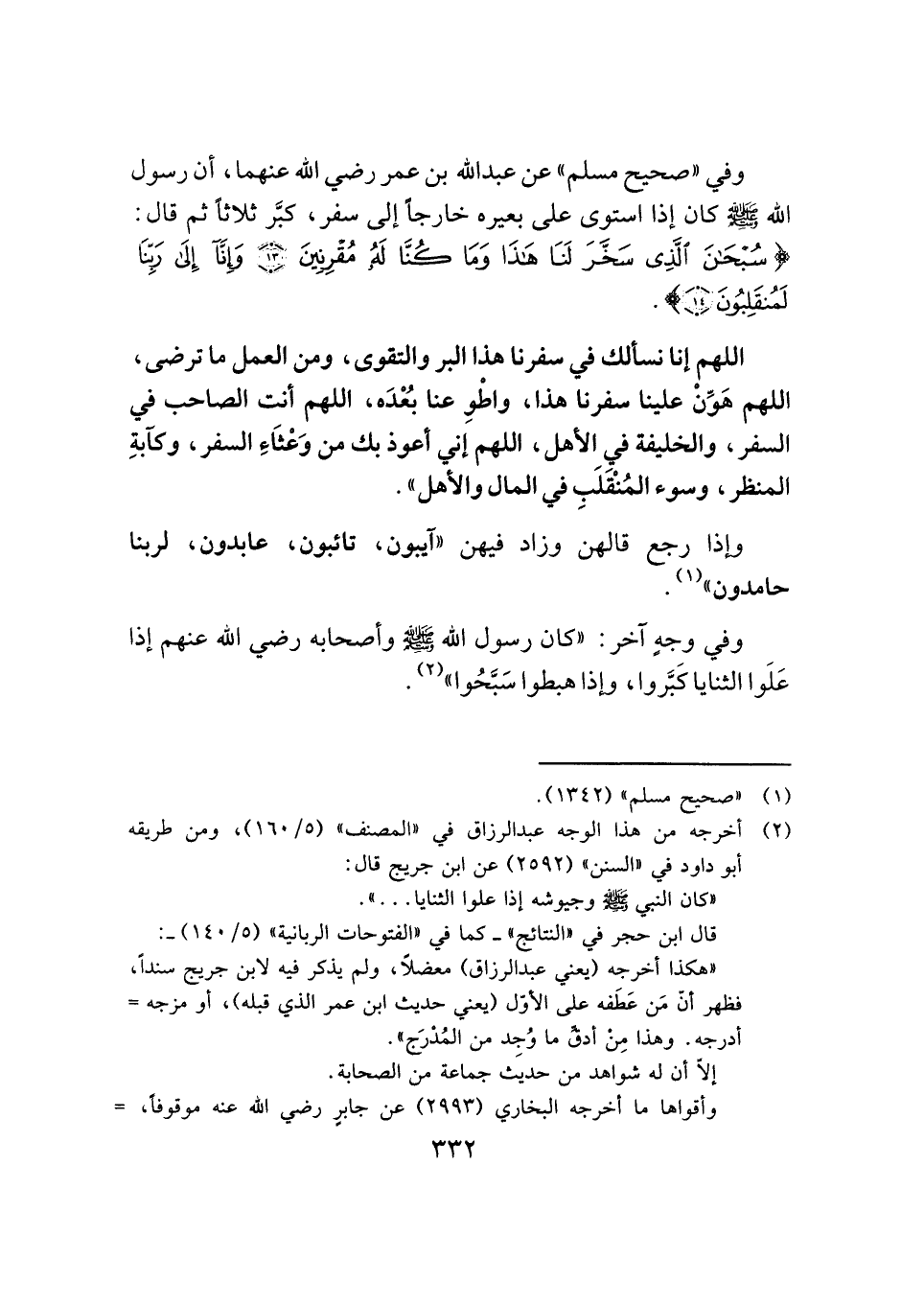 وفي "صحيح مسلم" عن عبد الله بن عمر -رضي الله عنهما-، أن رسول الله -صَلَّى اللهُ عَلَيْهِ وَسَلَّمَ- كان إذا استوى على بعيره خارجًا إلى سفر، كبَّر ثلاثًا ثم قال: {سُبْحَانَ الَّذِي سَخَّرَ لَنَا هَذَا وَمَا كُنَّا لَهُ مُقْرِنِينَ (١٣) وَإِنَّا إِلَى رَبِّنَا لَمُنْقَلِبُونَ (١٤) }.