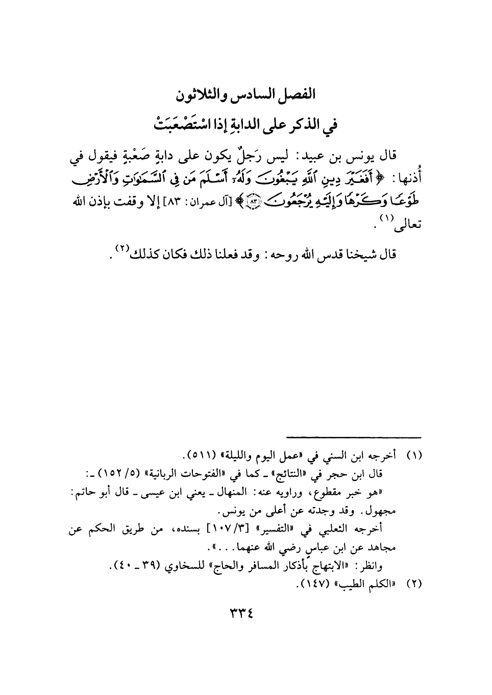 قال يونس بن عبيد: ليس رَجلٌ يكون على دابةٍ صَعْبةٍ فيقول في أُذنها: {أَفَغَيْرَ دِينِ اللَّهِ يَبْغُونَ وَلَهُ أَسْلَمَ مَنْ فِي السَّمَاوَاتِ وَالْأَرْضِ طَوْعًا وَكَرْهًا وَإِلَيْهِ يُرْجَعُونَ (٨٣)} [آل عمران: ٨٣] إلا وقفت بإذن الله تعالى (¬١).