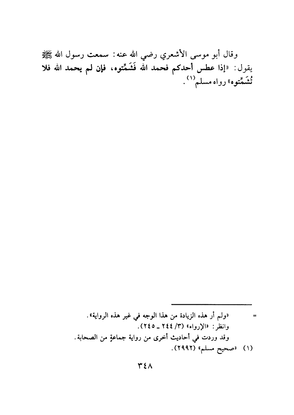 وقال أبو موسى الأشعري رضي الله عنه: سمعت رسول الله -صَلَّى اللهُ عَلَيْهِ وَسَلَّمَ- يقول: "إذا عطس أحدكم فحمد الله فَشَمِّتوه، فإن لم يحمد الله فلا تُشَمِّتوه" رواه مسلم (¬١).