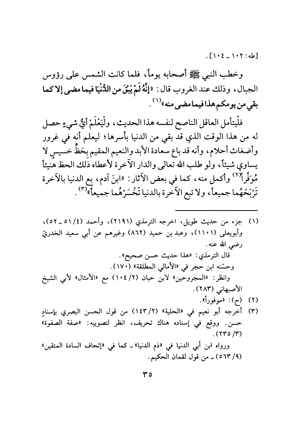 فلْيتأمل العاقل الناصح لنفسه هذا الحديث، ولْيَعْلَمْ أيُّ شيءٍ حصل له من هذا الوقت الذي قد بقي من الدنيا بأسرها؛ ليعلم أنه في غرور وأضغاث أحلام، وأنه قد باع سعادة الأبد والنعيم المقيم بِحَظٍّ خسيسٍ لا يساوي شيئًا، ولو طلب الله تعالى والدار الآخرة لأعطاه ذلك الحظ هنيئًا مُوَفَّرًا (¬٢) وأكمل منه، كما في بعض الآثار: "ابنَ آدم، بِع الدنيا بالآخرة تَرْبَحْهُما جميعًا، ولا تبع الآخرة بالدنيا تَخْسَرْهُما جميعًا" (¬٣).