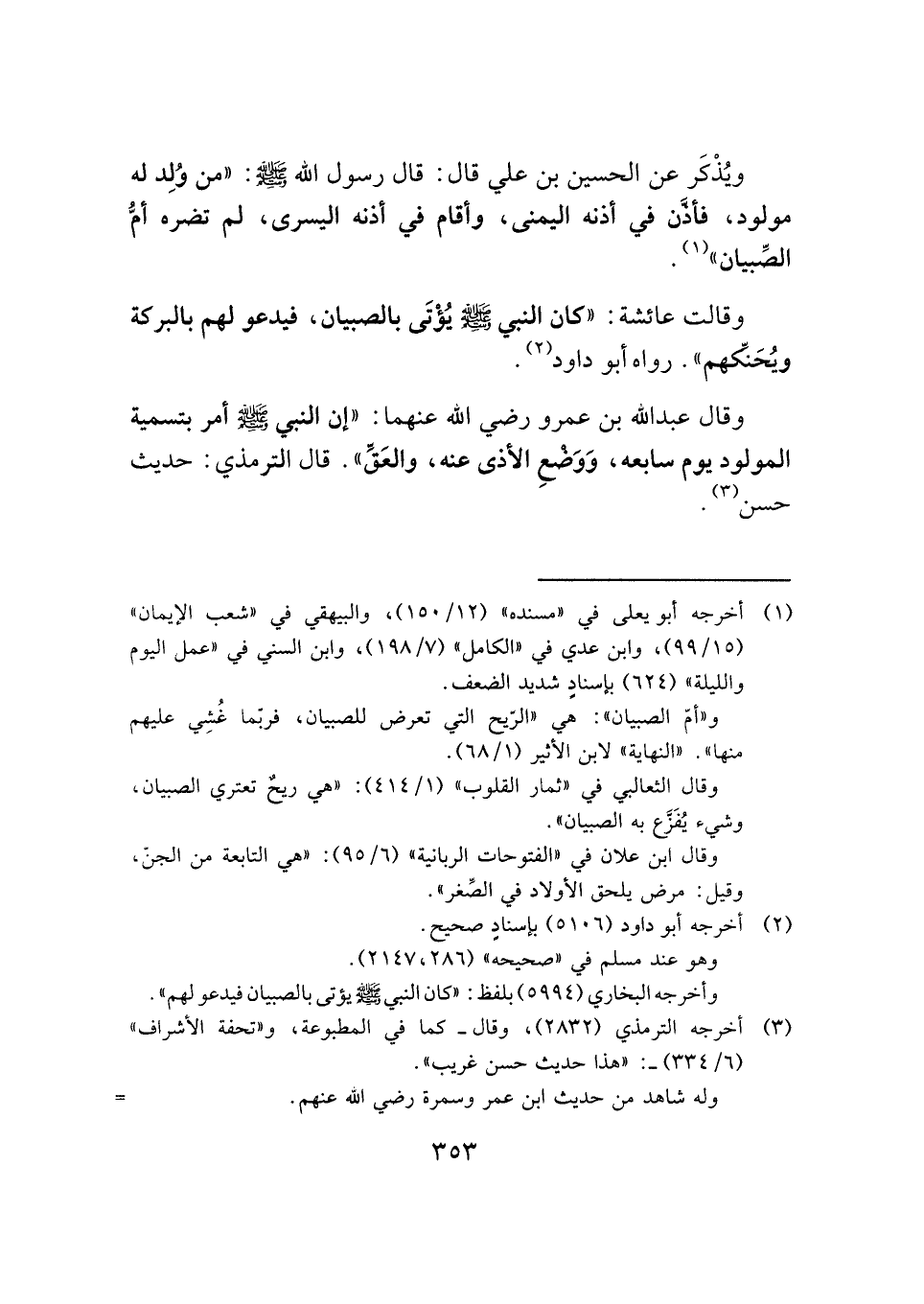 وقال عبد الله بن عمرو رضي الله عنهما: "إن النبي -صَلَّى اللهُ عَلَيْهِ وَسَلَّمَ- أمر بتسمية المولود يوم سابعه، وَوَضْعِ الأذى عنه، والعَقِّ". قال الترمذي: حديث حسن (¬٣) .