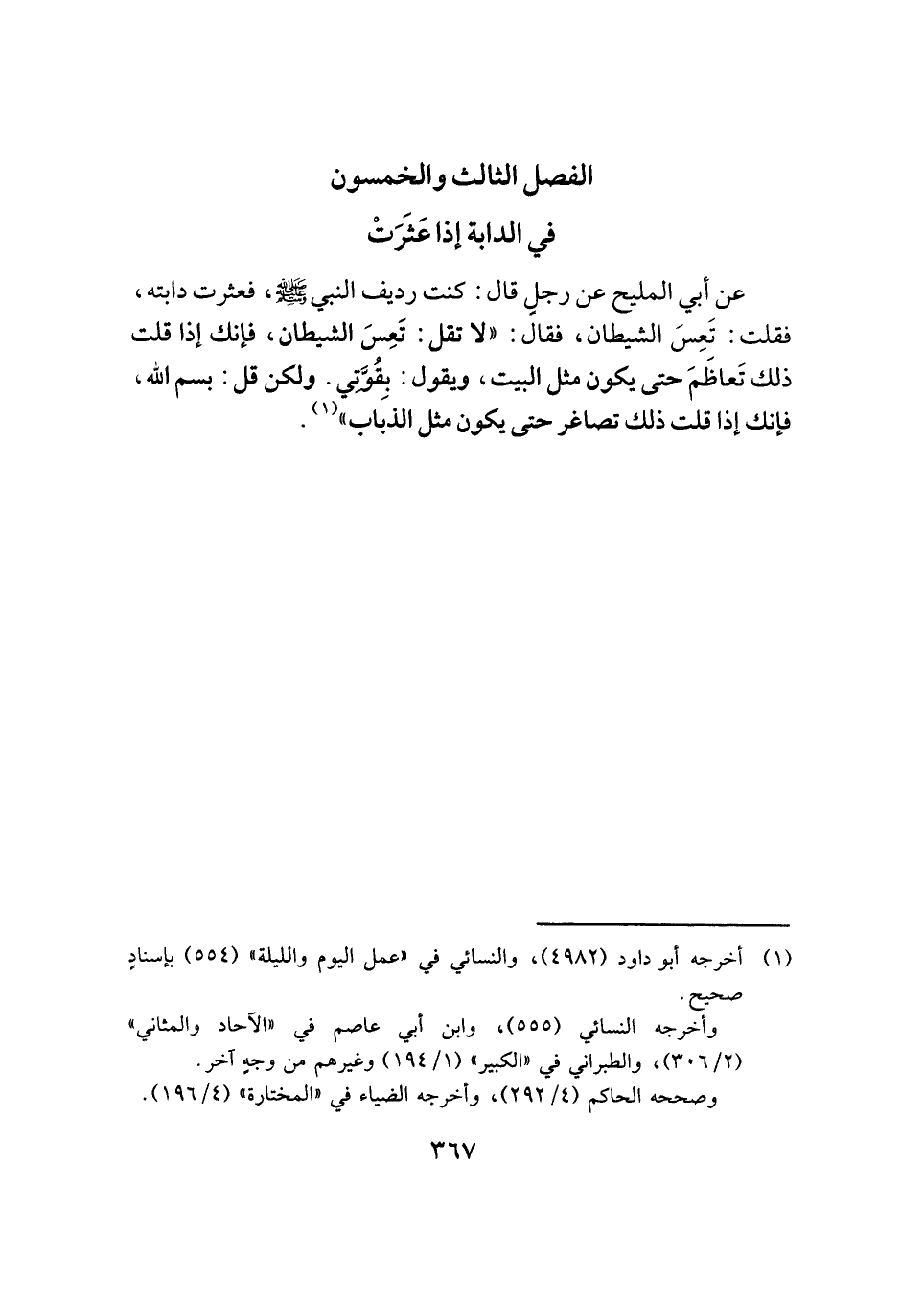 عن أبي المليح عن رجلٍ قال: كنت رديف النبي -صَلَّى اللهُ عَلَيْهِ وَسَلَّمَ-، فعثرت دابته، فقلت: تَعِسَ الشيطان، فقال: "لا تقل: تَعِسَ الشيطان، فإنك إذا قلت ذلك تَعاظَمَ حتى يكون مثل البيت، ويقول: بِقُوَّتِي. ولكن قل: بسم الله، فإنك إذا قلت ذلك تصاغر حتى يكون مثل الذباب" (¬١).