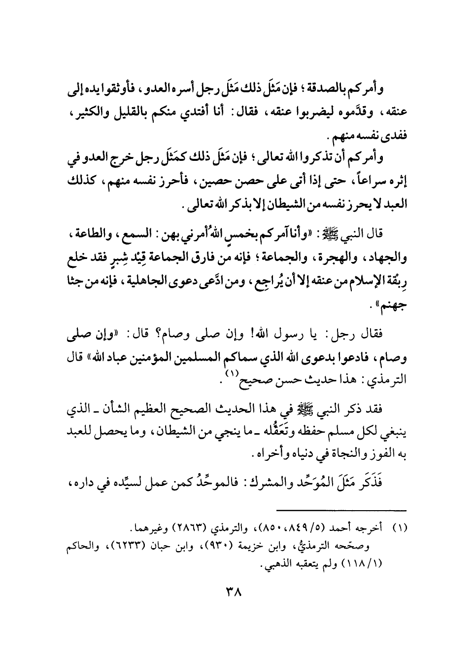 وأمركم أن تذكروا الله تعالى؛ فإن مَثَل ذلك كمَثَل رجل خرج العدو في إثره سراعًا، حتى إذا أتى على حصن حصين، فأحرز نفسه منهم، كذلك العبد لا يحرز نفسه من الشيطان إلا بذكر الله تعالى.