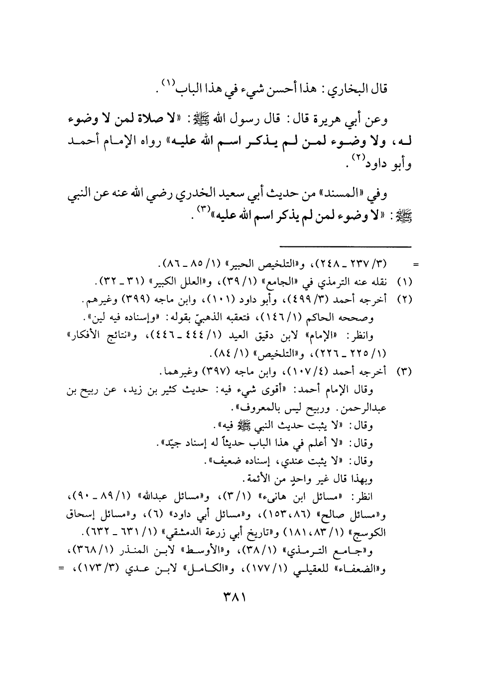 وعن أبي هريرة قال: قال رسول الله -صَلَّى اللهُ عَلَيْهِ وَسَلَّمَ-: "لا صلاة لمن لا وضوء له، ولا وضوء لمن لم يذكر اسم الله عليه" رواه الإمام أحمد وأبو داود (¬٢) .