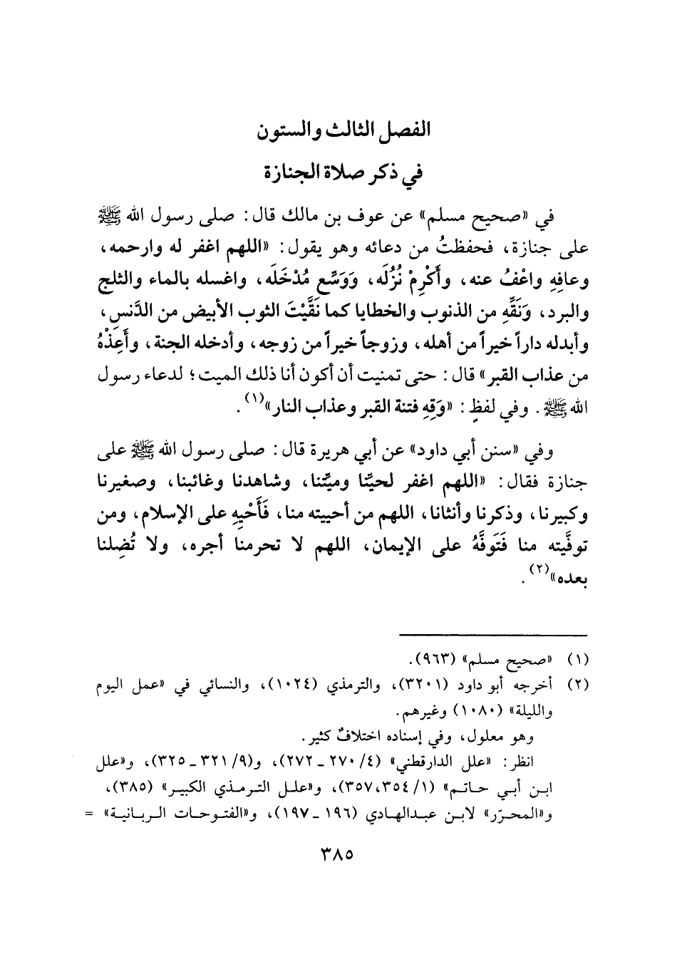 وفي "سنن أبي داود" عن أبي هريرة قال: صلى رسول الله -صَلَّى اللهُ عَلَيْهِ وَسَلَّمَ- على جنازة فقال: "اللَّهُمَّ اغفر لحيِّنا وميِّتنا، وشاهدنا وغائبنا، وصغيرنا وكبيرنا، وذكرنا وأنثانا، اللَّهُمَّ من أحييته منا، فَأَحْيهِ على الإسلام، ومن توفَّيته منا فَتَوفَّهُ على الإيمان، اللَّهُمَّ لا تحرمنَا أجره، ولا تُضِلنا بعده" (¬٢).
