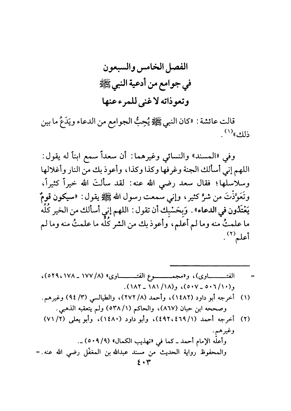الفصل الخامس والسبعون: في جوامع من أدعية النبي -صَلَّى اللهُ عَلَيْهِ وَسَلَّمَ- وتعوذاته لا غنى للمرء عنها