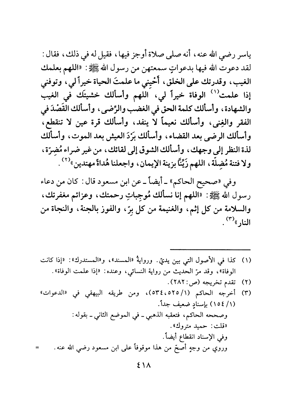ياسر رضي الله عنه، أنه صلى صلاة أوجز فيها، فقيل له في ذلك، فقال: لقد دعوت الله فيها بدعواتٍ سمعتهن من رسول الله -صَلَّى اللهُ عَلَيْهِ وَسَلَّمَ-: "اللَّهُمَّ بعلمك الغيب، وقدرتك على الخلق، أَحْيِني ما علمتَ الحياة خيرًا لي، وتوفني إذا علمت (¬١) الوفاة خيرًا لي، اللَّهُمَّ وأسألك خشيتَك في الغيب والشهادة، وأسألك كلمة الحق في الغضب والرِّضى، وأسألك القَصْدَ في الفقر والغِنى، وأسألك نعيمًا لا ينفد، وأسألك قرة عين لا تنقطع، وأسألك الرضى بعد القضاء، وأسألك بَرْدَ العيش بعد الموت، وأسألك لذة النظر إلى وجهك، وأسألك الشوق إلى لقائك، من غير ضراء مُضِرّة، ولا فتنة مُضِلّة، اللَّهُمَّ زَيِّنَّا بزينة الإيمان، واجعلنا هُداةً مهتدين" (¬٢) .
