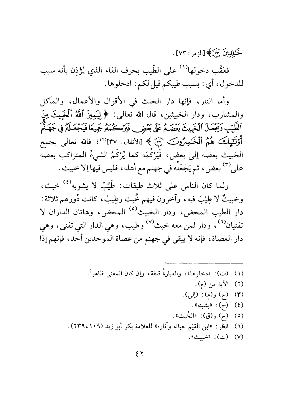 ولما كان الناس على ثلاث طبقات: طَيِّبٌ لا يشوبه (¬٤) خبث، وخبيثٌ لا طِيْبَ فيه، وآخرون فيهم خُبث وطِيبْ، كانت دُورهم ثلاثة: دار الطيب المحض، ودار الخبيث (¬٥) المحض، وهاتان الداران لا تفنيان (¬٦)، ودار لمن معه خبث (¬٧) وطيب، وهي الدار التي تفنى، وهي دار العصاة، فإنه لا يبقى في جهنم من عصاة الموحدين أحد، فإنهم إذا