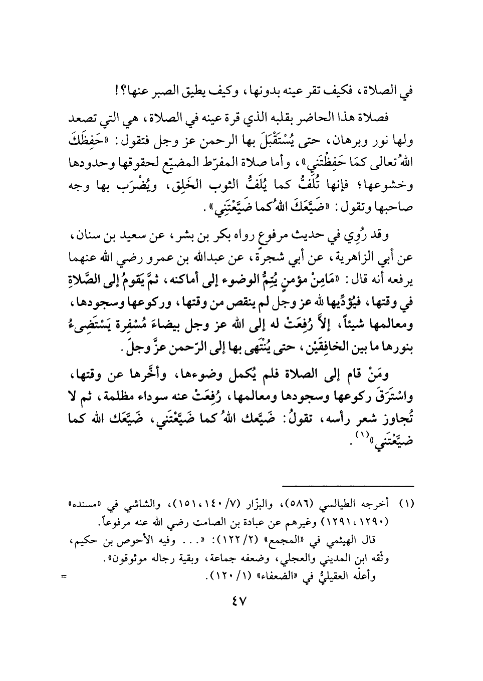 في الصلاة، فكيف تقر عينه بدونها، وكيف يطيق الصبر عنها؟! فصلاة هذا الحاضر بقلبه الذي قرة عينه في الصلاة، هي التي تصعد ولها نور وبرهان، حتى يُسْتَقْبَلَ بها الرحمن عز وجل فتقول: "حَفِظَكَ اللهُ تعالى كمَا حَفِظْتَني"، وأما صلاة المفرّط المضيّع لحقوقها وحدودها وخشوعها؛ فإنها تُلَفُّ كما يُلَفُّ الثوب الخَلِق، ويُضْرَب بها وجه صاحبها وتقول: "ضَيَّعَكَ اللهُ كما ضَيَّعْتَنِي".