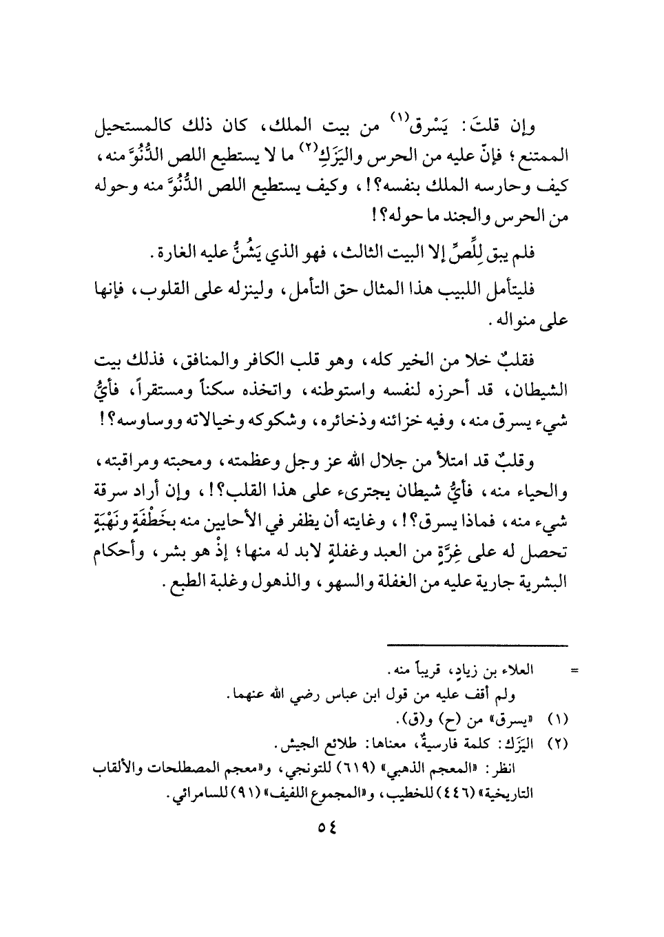 وإن قلتَ: يَسْرق (¬١) من بيت الملك، كان ذلك كالمستحيل الممتنع؛ فإنّ عليه من الحرس واليَزَكِ (¬٢) ما لا يستطيع اللص الدُّنُوَّ منه، كيف وحارسه الملك بنفسه؟!، وكيف يستطيع اللص الدُّنُوَّ منه وحوله من الحرس والجند ما حوله؟!