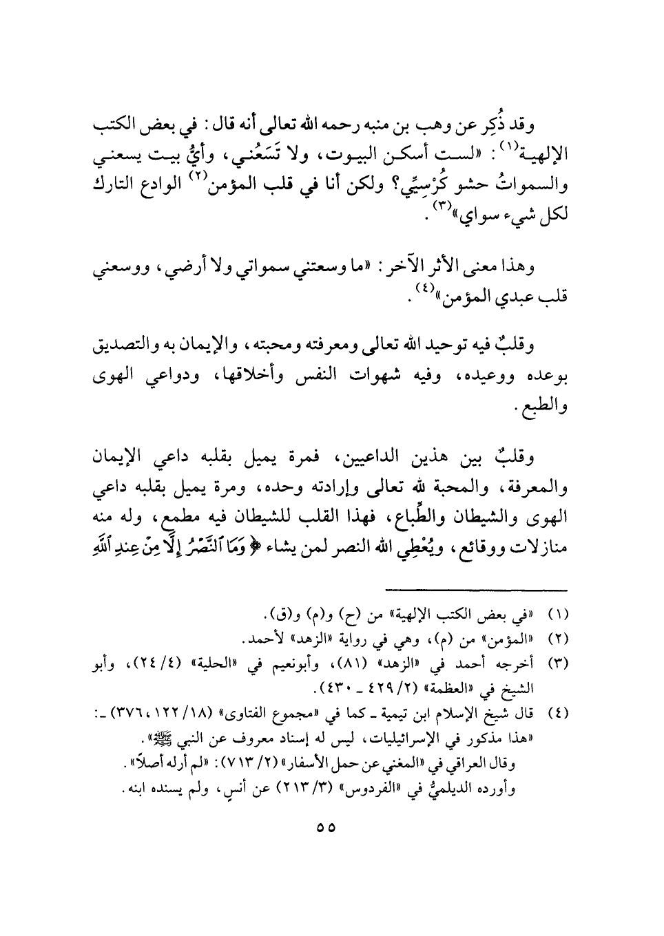 وقد ذُكِر عن وهب بن منبه رحمه الله تعالى أنه قال: في بعض الكتب الإلهية (¬١) : "لست أسكن البيوت، ولا تَسَعُني، وأيُّ بيت يسعني والسمواتُ حشو كُرْسِيِّي؟ ولكن أنا في قلب المؤمن (¬٢) الوادع التارك لكل شيء سواي" (¬٣) .