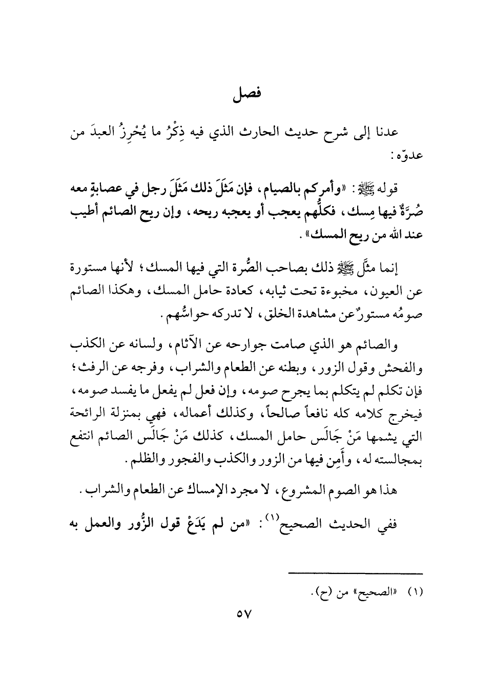 عدنا إلى شرح حديث الحارث الذي فيه ذِكْرُ ما يُحْرِزُ العبدَ من عدوّه: