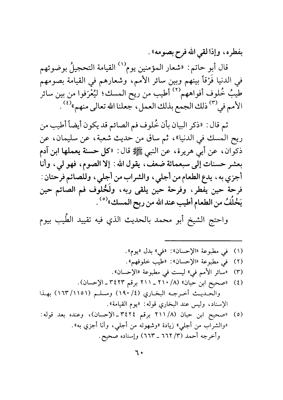 قال أبو حاتم: "شعار المؤمنين يوم (¬١) القيامة التحجيلُ بوضوئهم في الدنيا فَرْقًا بينهم وبين سائر الأمم، وشعارهم في القيامة بصومهم طيبُ خُلوف أفواههم (¬٢) أطيب من ريح المسك؛ ليُعْرَفوا من بين سائر الأمم في (¬٣) ذلك الجمع بذلك العمل، جعلنا الله تعالى منهم" (¬٤).