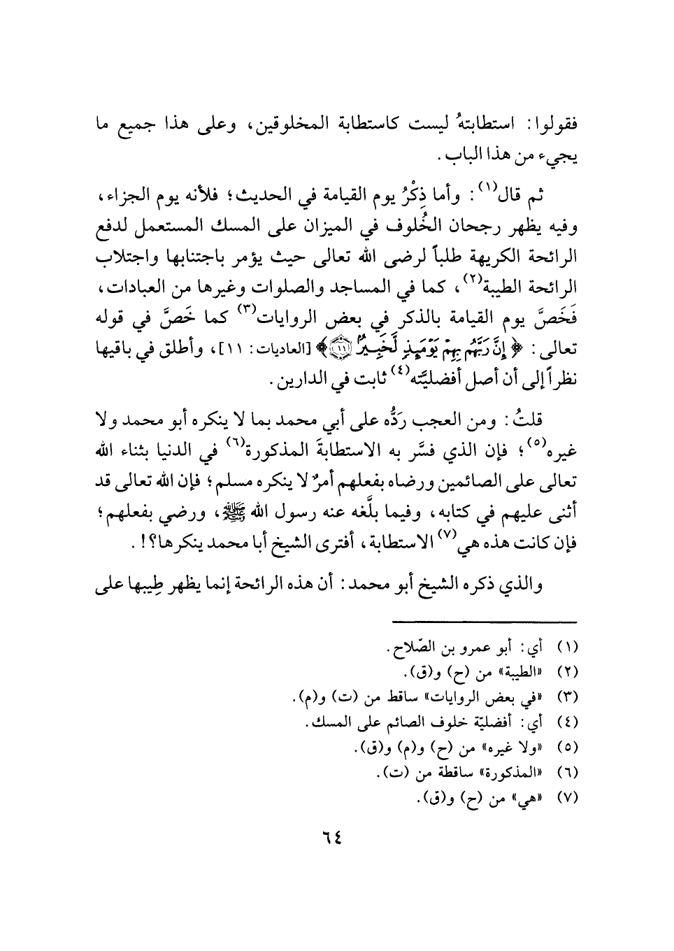 قلتُ: ومن العجب رَدُّه على أبي محمد بما لا ينكره أبو محمد ولا غيره (¬٥)؛ فإن الذي فسَّر به الاستطابةَ المذكورة (¬٦) في الدنيا بثناء الله تعالى على الصائمين ورضاه بفعلهم أمرٌ لا ينكره مسلم؛ فإن الله تعالى قد أثنى عليهم في كتابه، وفيما بلَّغه عنه رسول الله -صَلَّى اللهُ عَلَيْهِ وَسَلَّمَ-، ورضي بفعلهم؛ فإن كانت هذه هي (¬٧) الاستطابة، أفترى الشيخ أبا محمد ينكرها؟!.