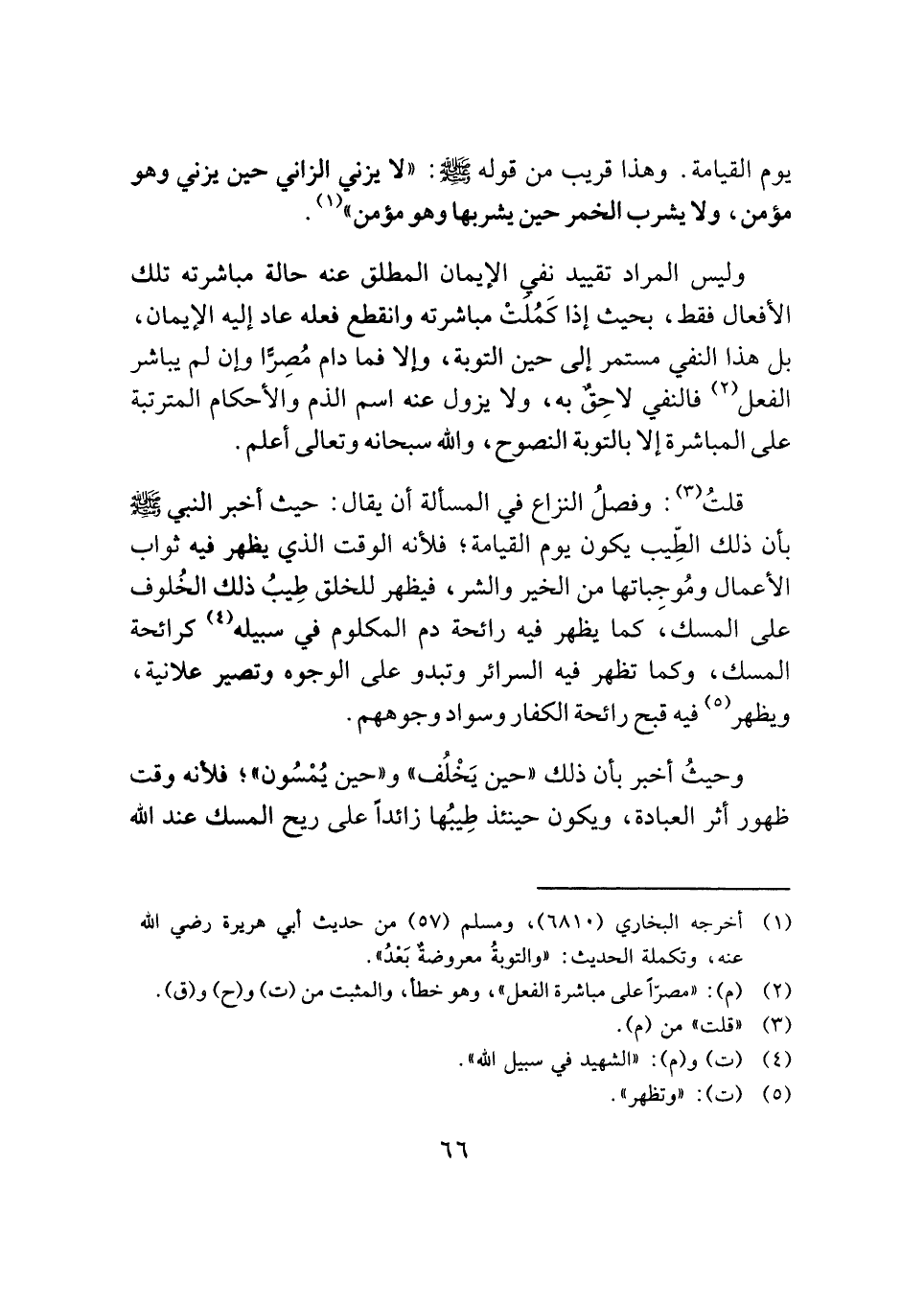 وليس المراد تقييد نفى الإيمان المطلق عنه حالة مباشرته تلك الأفعال فقط، بحيث إذا كَمُلَتْ مباشرته وانقطع فعله عاد إليه الإيمان، بل هذا النفي مستمر إلى حين التوبة، وإلا فما دام مُصِرًّا وإن لم يباشر الفعل (¬٢) فالنفي لاحِقٌ به، ولا يزول عنه اسم الذم والأحكام المترتبة على المباشرة إلا بالتوبة النصوح، والله سبحانه وتعالى أعلم.