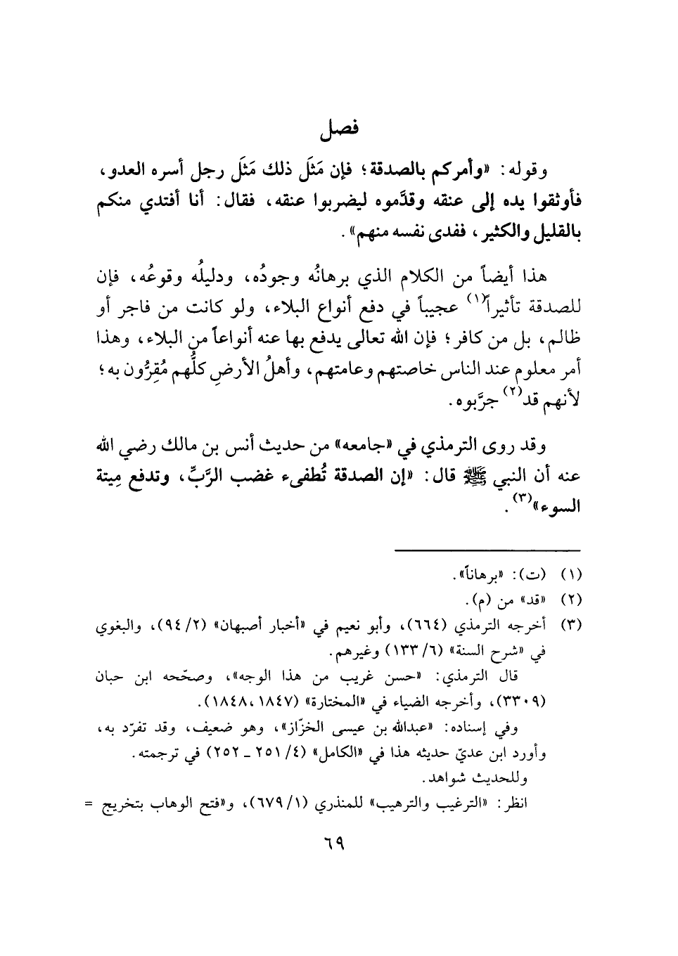 وقد روى الترمذي في "جامعه" من حديث أنس بن مالك رضي الله عنه أن النبي -صَلَّى اللهُ عَلَيْهِ وَسَلَّمَ- قال: "إن الصدقة تُطفئ غضب الرَّبِّ، وتدفع مِيتة السوء" (¬٣).