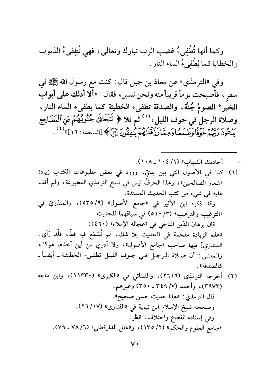 (¬١) كذا في الأصول التي بين يديّ، وورد في بعض مطبوعات الكتاب زيادة "شعار الصالحين"، وهذا الحرفُ ليس في نسخ الترمذي المطبوعة، ولم أقف عليه في شيء من كتب الحديث المسندة.