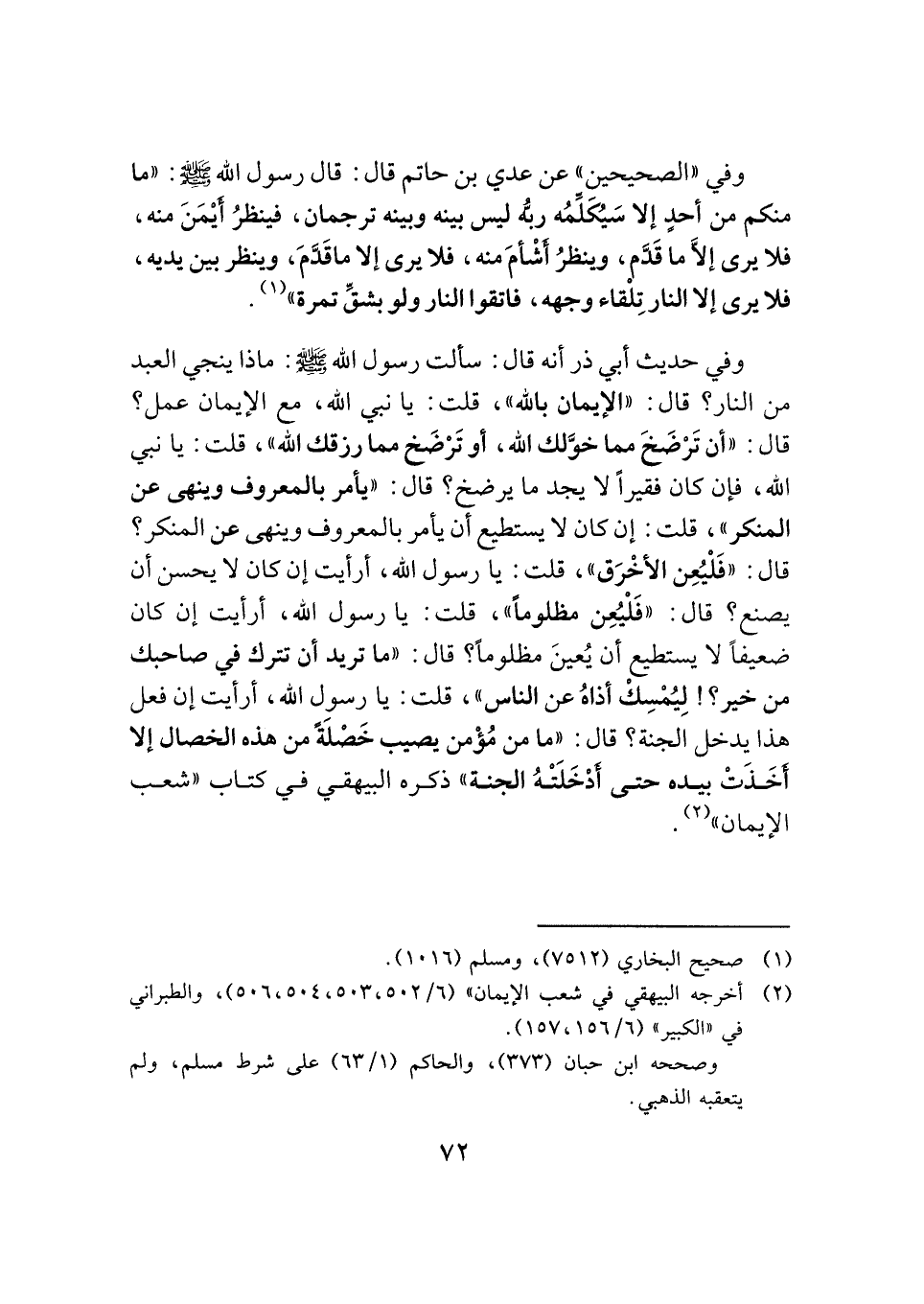 وفي "الصحيحين" عن عدي بن حاتم قال: قال رسول الله -صَلَّى اللهُ عَلَيْهِ وَسَلَّمَ-: "ما منكم من أحدٍ إلا سَيُكَلِّمُه ربُّه ليس بينه وبينه ترجمان، فينظرُ أَيْمَنَ منه، فلا يرى إلَّا ما قَدَّم، وينظرُ أَشْأمَ منه، فلا يرى إلا ما قَدَّمَ، وينظر بين يديه، فلا يرى إلا النار تِلْقاء وجهه، فاتقوا النار ولو بشقِّ تمرة" (¬١) .
