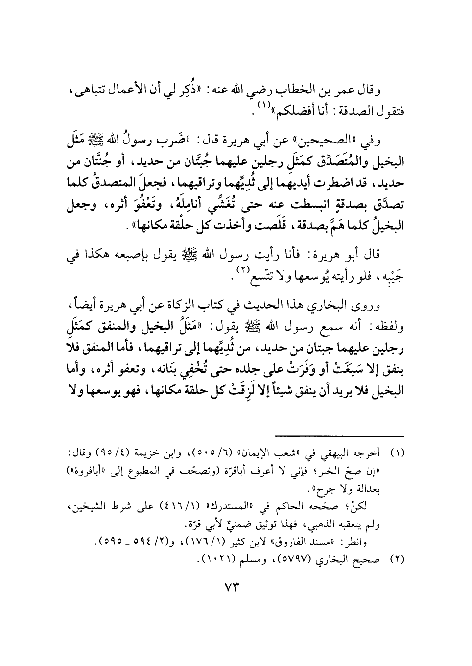 وفي "الصحيحين" عن أبي هريرة قال: "ضَرب رسولُ الله -صَلَّى اللهُ عَلَيْهِ وَسَلَّمَ- مَثَل البخيل والمُتَصَدِّق كمَثَلِ رجلين عليهما جُبَّتان من حديد، أو جُنَّتان من حديد، قد اضطرت أيديهما إلى ثُدِيِّهما وتراقيهما، فجعلَ المتصدقُ كلما تصدَّق بصدقةٍ انبسطت عنه حتى تُغَشِّي أنامِلَهُ، وتَعْفُوَ أثره، وجعل البخيلُ كلما هَمَّ بصدقة، قَلَصت وأخذت كل حلْقة مكانها".