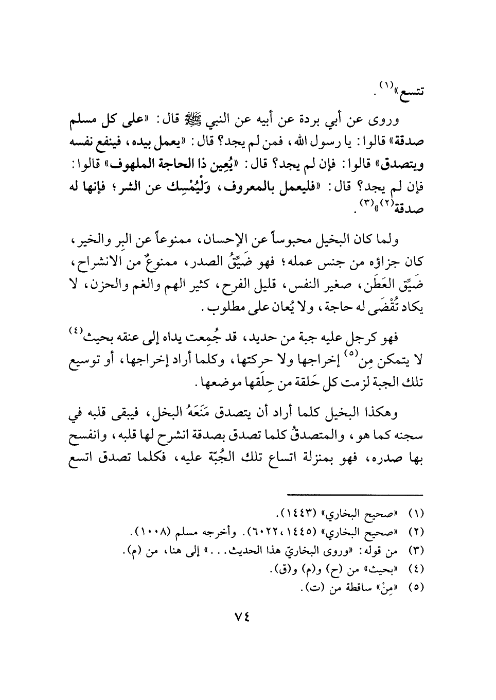 وهكذا البخيل كلما أراد أن يتصدق مَنَعَهُ البخل، فيبقى قلبه في سجنه كما هو، والمتصدقُ كلما تصدق بصدقة انشرح لها قلبه، وانفسح بها صدره، فهو بمنزلة اتساع تلك الجُبّة عليه، فكلما تصدق اتسع