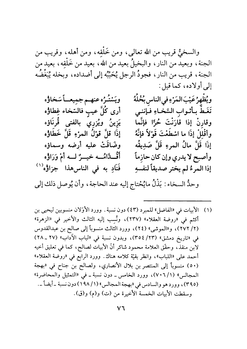 (¬١) الأبيات في "الفاضل" للمبرد (٤٣) دون نسبة. وورد الأوّلان منسوبين ليحيى بن أكثم في "روضة العقلاء" (٢٣٧)، ونُسِب إليه الثالث والأخير في "الزهرة" (٢/ ٢٧٢)، و"الموشى" (٢٤)، وورد الثالث منسوبًا إلى صالح بن عبد القدوس في "تاريخ دمشق" (٢٣/ ٣٥٤)، وبدون نسبة في "لباب الآداب" (٢٧ - ٢٨) لابن منقذ، وحقّق العلامة محمود شاكر أنّ الأبيات لصالح، كما في تعليق أخيه أحمد على "اللباب"، وانظر بقيّة كلامه هناك. وورد الرابع في "روضة العقلاء" (٥٠) منسوبًا إلى المنتصر بن بلال الأنصاري، ولصالح بن جناح في "بهجة المجالس" (١/ ٧٠٦)، وورد الخامس -دون نسبة- في "التمثيل والمحاضرة" (٣٩٥)، وورد هو والسادس في "بهجة المجالس" (١/ ١٩٨) دون نسبة -أيضًا-.