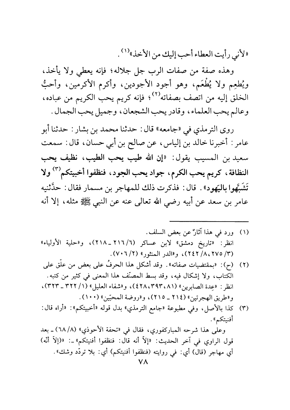 روى الترمذي في "جامعه" قال: حدثنا محمد بن بشار: حدثنا أبو عامر: أخبرنا خالد بن إلياس، عن صالح بن أبي حسان، قال: سمعت سعيد بن المسيب يقول: "إن الله طيب يحب الطيب، نظيف يحب النظافة، كريم يحب الكرم، جواد يحب الجود، فنظفوا أخبيتكم (¬٣) ولا تَشَبَّهوا باليَهود". قال: فذكرت ذلك للمهاجر بن مسمار فقال: حدَّثنيه عامر بن سعد عن أبيه رضي الله تعالى عنه عن النبي -صَلَّى اللهُ عَلَيْهِ وَسَلَّمَ- مثله، إلا أنه