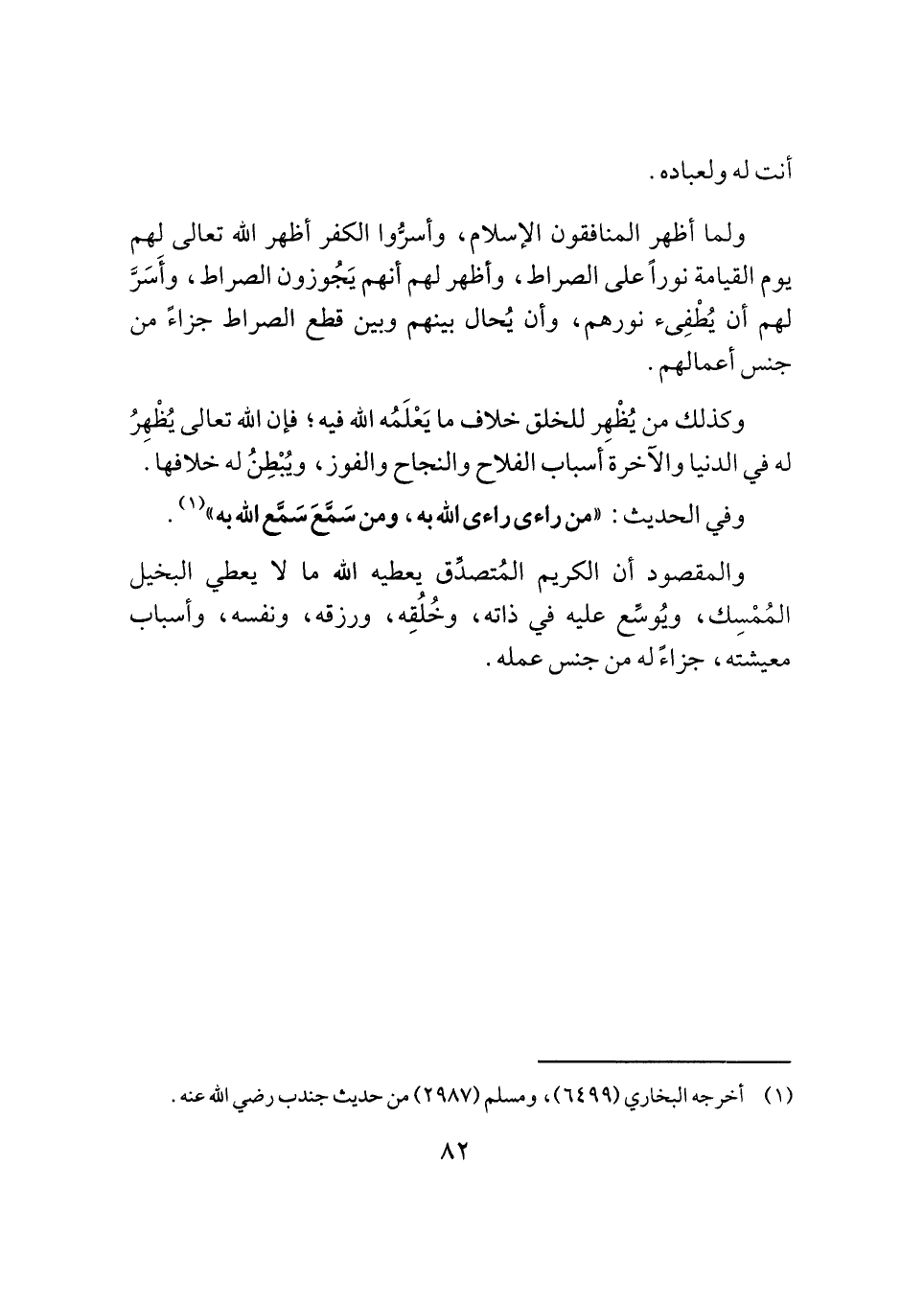 ولما أظهر المنافقون الإسلام، وأسرُّوا الكفر أظهر الله تعالى لهم يوم القيامة نورًا على الصراط، وأظهر لهم أنهم يَجُوزون الصراط، وأَسَرَّ لهم أن يُطْفِئ نورهم، وأن يُحال بينهم وبين قطع الصراط جزاءً من جنس أعمالهم.
