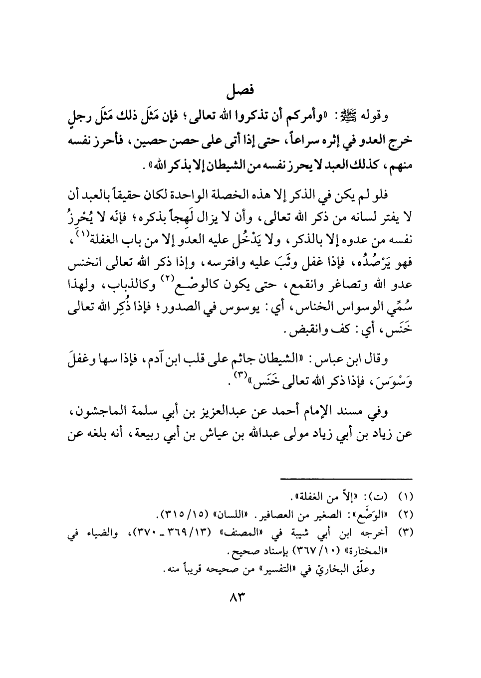 فلو لم يكن في الذكر إلا هذه الخصلة الواحدة لكان حقيقًا بالعبد أن لا يفتر لسانه من ذكر الله تعالى، وأن لا يزال لَهِجًا بذكره؛ فإنّه لا يُحْرِزُ نفسه من عدوه إلا بالذكر، ولا يَدْخُل عليه العدو إلا من باب الغفلة (¬١)، فهو يَرْصُدُه، فإذا غفل وثَبَ عليه وافترسه، وإذا ذكر الله تعالى انخنس عدو الله وتصاغر وانقمع، حتى يكون كالوصْع (¬٢) وكالذباب، ولهذا سُمِّي الوسواس الخناس، أي: يوسوس في الصدور؛ فإذا ذُكِر الله تعالى خَنَس، أي: كف وانقبض.