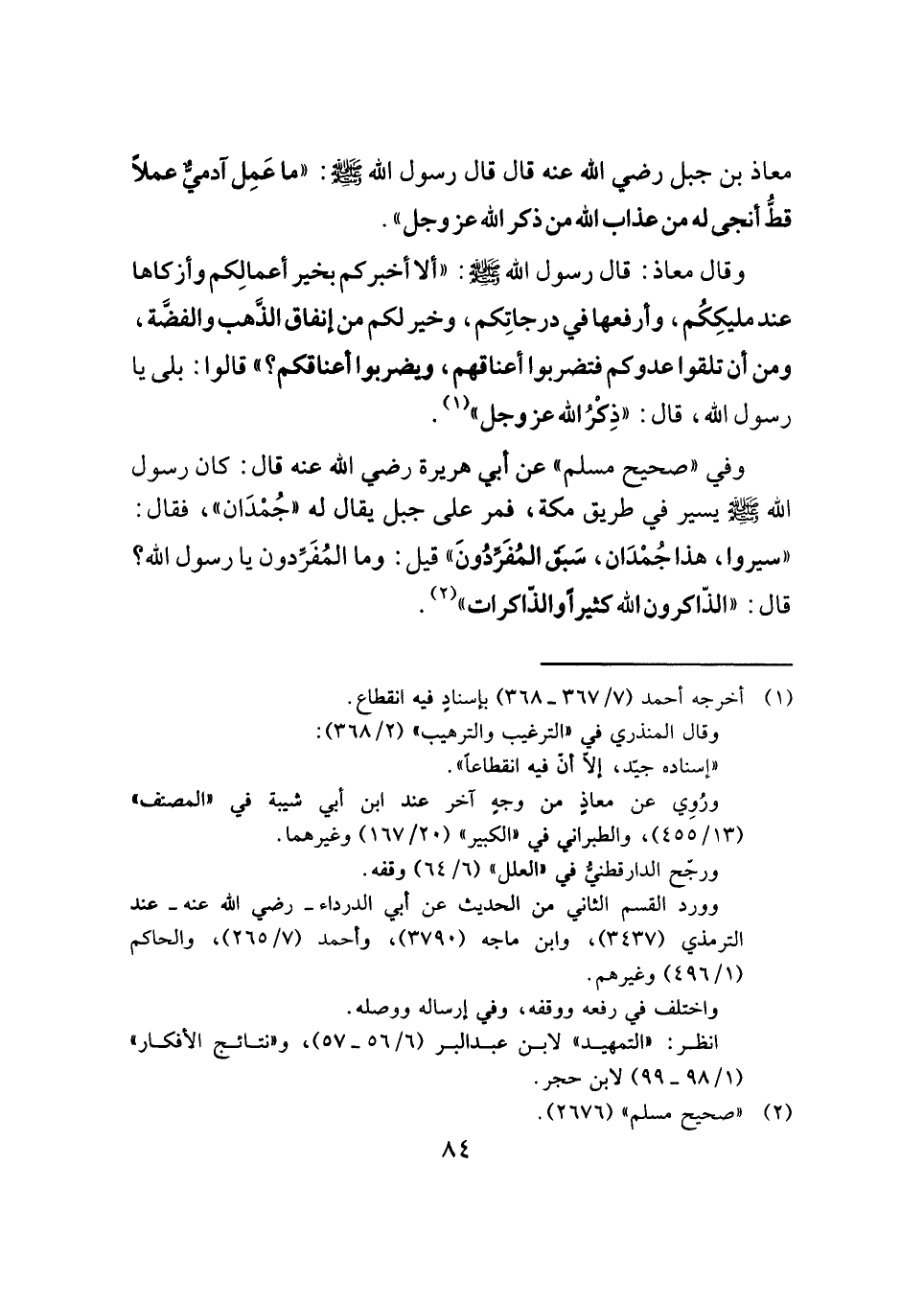 وقال معاذ: قال رسول الله -صَلَّى اللهُ عَلَيْهِ وَسَلَّمَ-: "ألا أخبركم بخير أعمالِكم وأزكاها عند مليكِكُم، وأرفعها في درجاتِكم، وخير لكم من إنفاق الذَّهب والفضَّة، ومن أن تلقوا عدوكم فتضربوا أعناقهم، ويضربوا أعناقكم؟ " قالوا: بلى يا رسول الله، قال: "ذِكْرُ الله عز وجل" (¬١) .