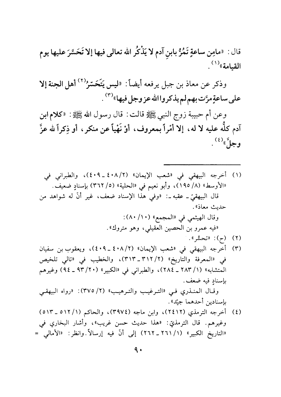 وذكر عن معاذ بن جبل يرفعه أيضًا: "ليس يَتَحَسّرُ (¬٢) أهل الجنة إلا على ساعةٍ مرَّت بهم لم يذكروا الله عز وجل فيها" (¬٣) .