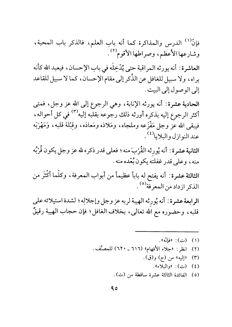 العاشرة: أنه يورثه المراقبة حتى يُدْخِلَه في باب الإحسان، فيعبد الله كأنه يراه، ولا سبيل للغافل عن الذِّكر إلى مقام الإحسان، كما لا سبيل للقاعد إلى الوصول إلى البيت.