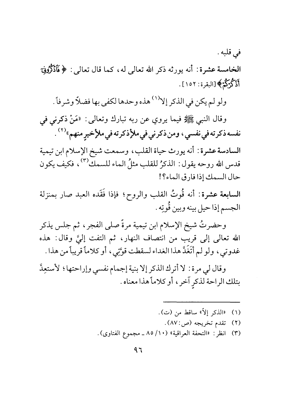 وقال لي مرة: لا أترك الذكر إلا بنية إجمام نفسي وإراحتها؛ لأستعِدَّ بتلك الراحة لذكرٍ آخر، أو كلامًا هذا معناه.