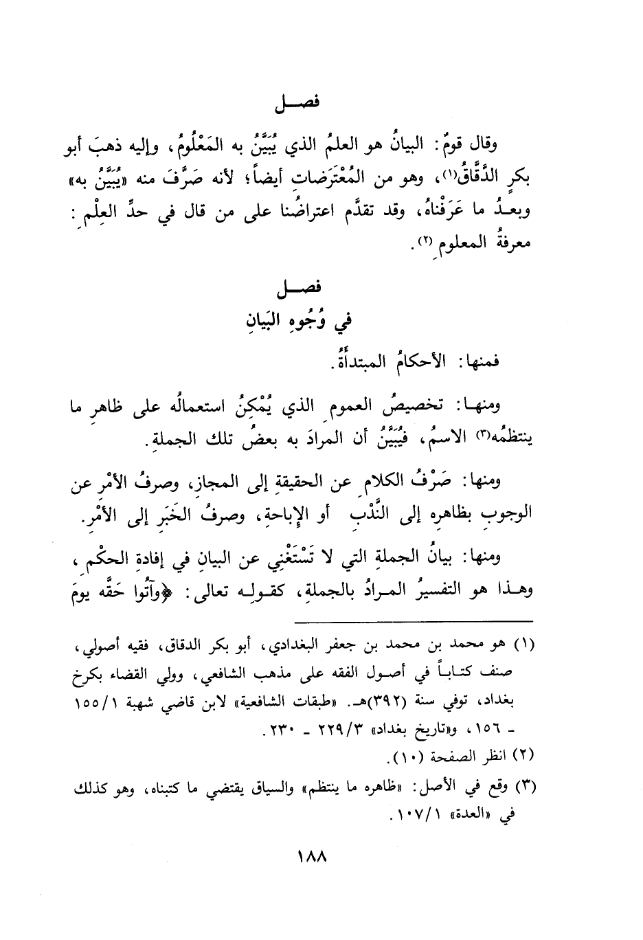 (١) هو محمد بن محمد بن جعفر البغدادي، أبو بكر الدقاق، فقيه أصولي، صنف كتاباً في أصول الفقه على مذهب الشافعي، وولي القضاء بكرخ بغداد، توفي سنة (٣٩٢) هـ. "طبقات الشافعية" لابن قاضي شهبة ١/ ١٥٥ - ١٥٦، و"تاريخ بغداد" ٣/ ٢٢٩ - ٢٣٠.