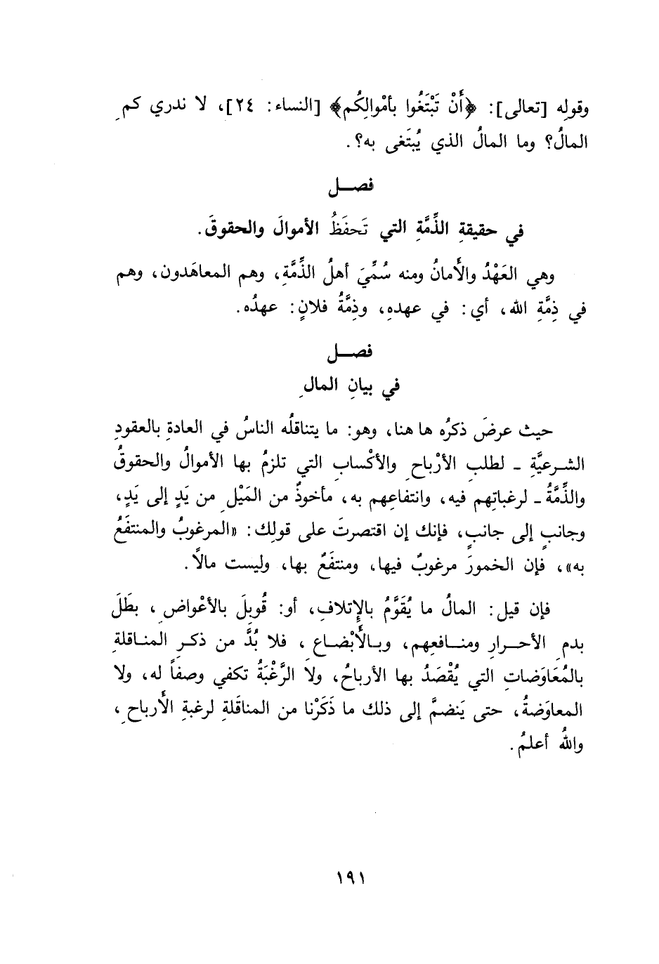 فإن قيل: المال ما يقَومُ بالإتلافِ، أو: قوبِلَ بالأعْواض، بطَلَ بدم الأحرارِ ومنافعِهم، وبالأبْضاع، فلا بد من ذكرِ المناقلةِ بالمعًاوَضاتِ التي يقْصَدُ بها الأرباح، ولاَ الرغْبَةُ تكفي وصفاً له، ولا المعاوَضةُ، حتى يَنضمَّ إلى ذلك ما ذَكَرْنا من المناقَلةِ لرغبةِ الأرباحِ، واللهُ أعلمُ.