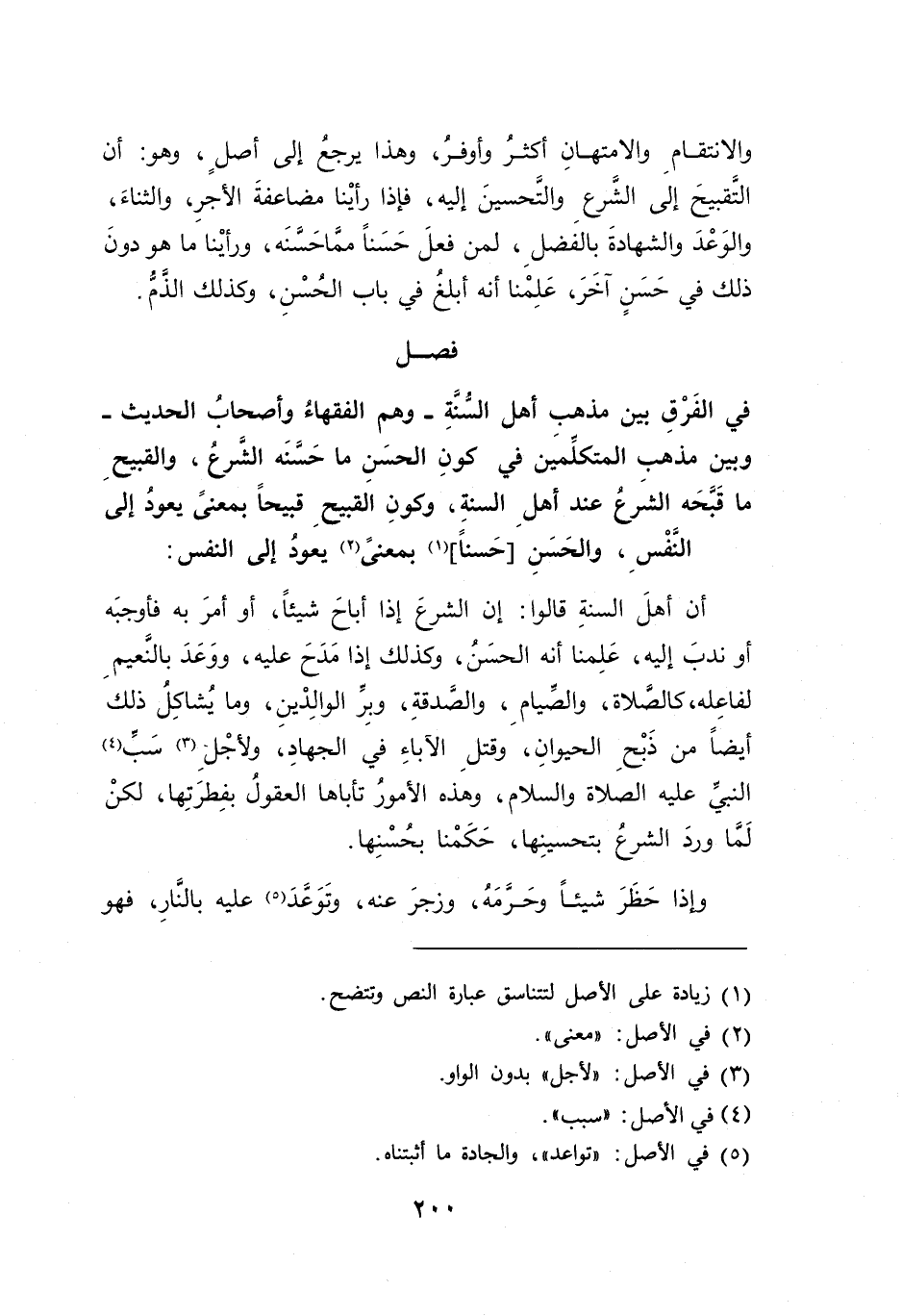 أن أهلَ السنةِ قالوا: إن الشرعَ إذا أباحَ شيئاً، أو أمرَ به فأوجبَه أو ندبَ إليه، عَلِمنا أنه الحسَنُ، وكذلك إذا مَدَحَ عليه، ووَعَدَ بالنَعيم لفاعِله، كالصَلاة، والصَيامِ، والصَدقةِ، وبِر الوالِدْينِ، وما يُشاكِلُ ذلكَ أيضاً من ذَبْحِ الحيوانِ، وقتلِ الآباءِ في الجهادِ، ولأجْلِ (٣) سَبِّ (٤) النبيِّ عليه الصلاة والسلام، وهذه الأمورُ تأباها العقولُ بفِطرَتِها، لكنْ لَمَّا وردَ الشرعُ بتحسينِها، حَكَمْنا بحُسْنِها.