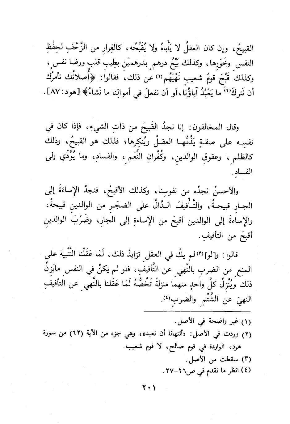 القبيحُ، وإن كان العقلُ لا يَأْباهُ ولا يُقَبحُه، كالفِرارِ من الزَحْفِ لحِفْظِ النفسِ وخَوَرِها، وكذلك بَيْعُ درهمٍ بدرهميْنِ بطِيب قلب ورضا نفسٍ، وكذلك قَبحَ قومُ شعيبِ نَهْيَهُم (١) عن ذلك، فقالواَ: {أَصَلَاتُكَ تَأْمُرُكَ أَنْ نَتْرُكَ (٢) مَا يَعْبُدُ آبَاؤُنَا أَوْ أَنْ نَفْعَلَ فِي أَمْوَالِنَا مَا نَشَاءُ} [هود: ٨٧].
